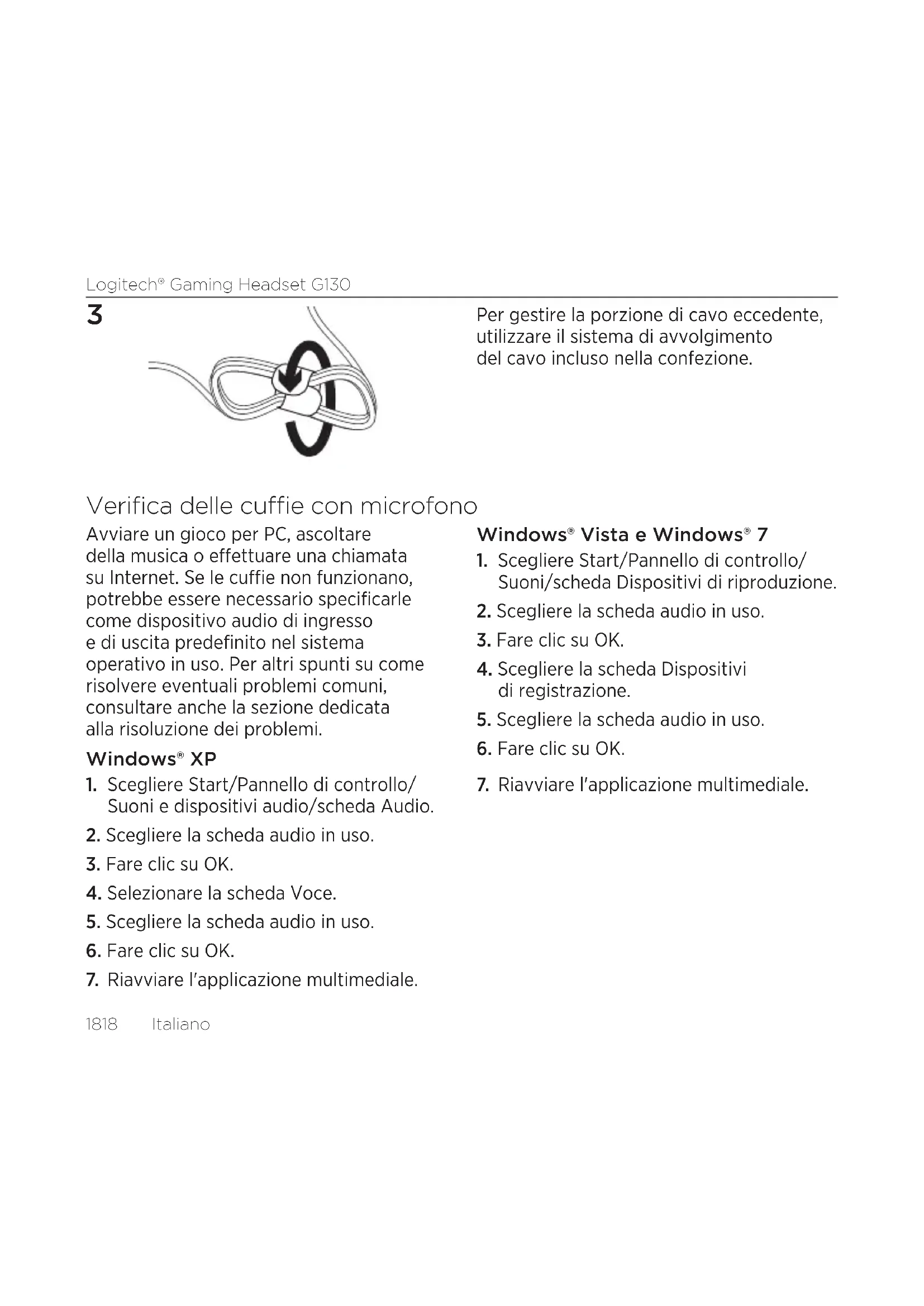 Per gestire la porzione di cavo eccedente, utilizzare il sistema di avvolgimento del cavo incluso nella confezione. Verifica delle cue con microfono Avviare un gioco per PC, ascoltare della musica o eettuare una chiamata su Internet. Se le cue non funzionano, potrebbe essere necessario specificarle come dispositivo audio di ingresso e di uscita predefinito nel sistema operativo in uso. Per altri spunti su come risolvere eventuali problemi comuni, consultare anche la sezione dedicata alla risoluzione dei problemi. Windows® XP