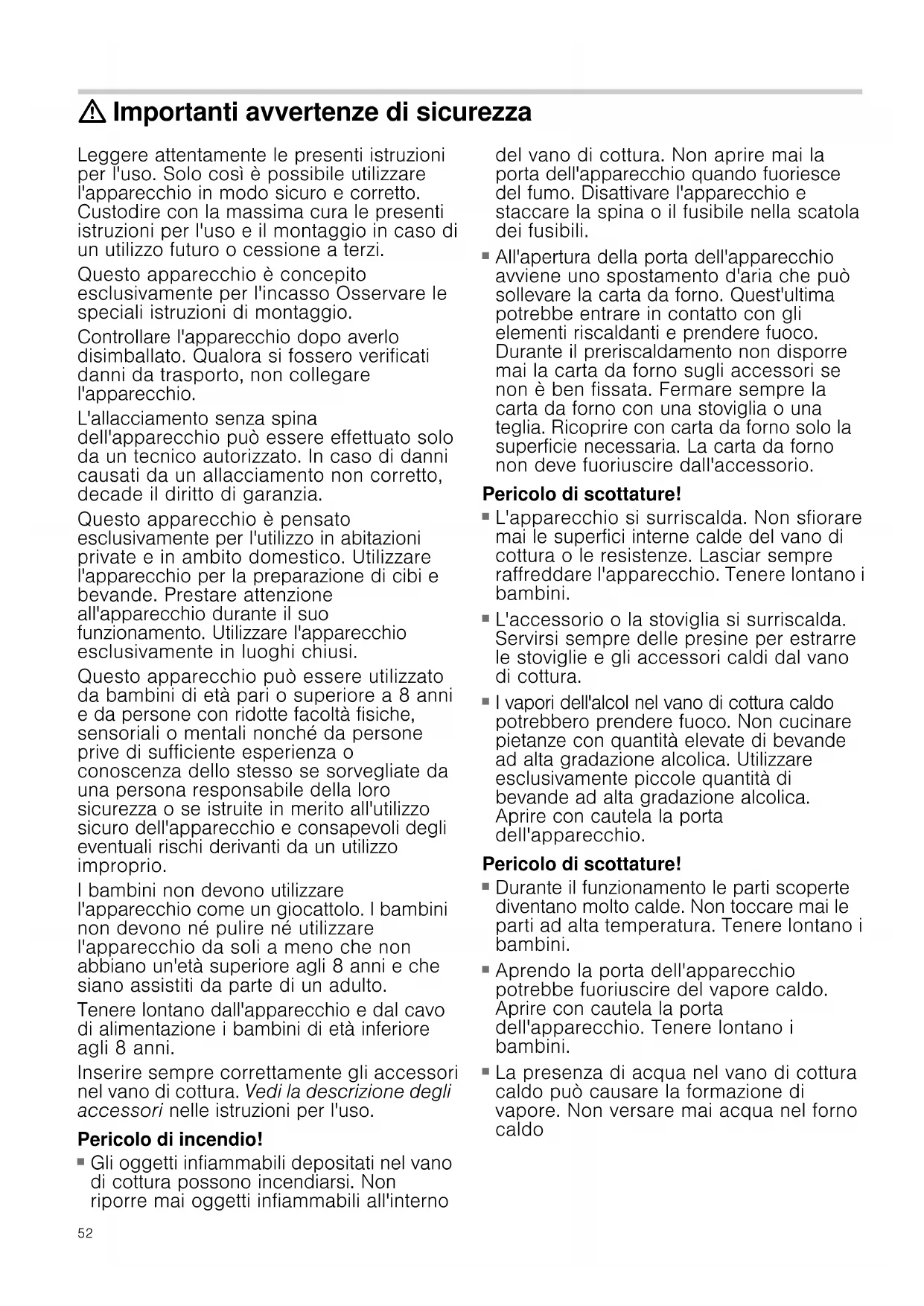 Gli oggetti infiammabili depositati nel vano di cottura possono incendiarsi. Non riporre mai oggetti infiammabili all'interno del vano di cottura. Non aprire mai la porta dell'apparecchio quando fuoriesce del fumo. Disattivare l'apparecchio e staccare la spina o il fusibile nella scatola dei fusibili. Pericol o di incendio!