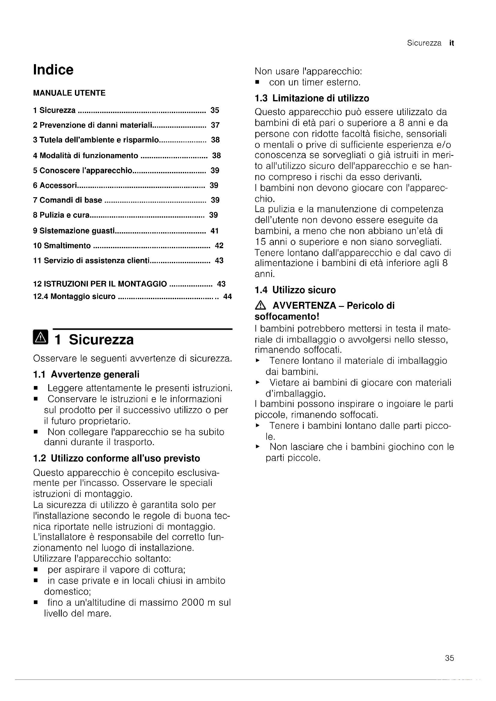 1 Sicurezza Osservare le seguenti avvertenze di sicurezza. 1.1 Avvertenze generali ¡ Leggere attentamente le presenti istruzioni. ¡ Conservare le istruzioni e le informazioni sul prodotto per il successivo utilizzo o per il futuro proprietario. ¡ Non collegare l'apparecchio se ha subito danni durante il trasporto. 1.2 Utilizzo conforme all'uso previsto Questo apparecchio è concepito esclusiva- mente per l'incasso. Osservare le speciali istruzioni di montaggio. La sicurezza di utilizzo è garantita solo per l'installazione secondo le regole di buona tec- nica riportate nelle istruzioni di montaggio. L'installatore è responsabile del corretto fun- zionamento nel luogo di installazione. Utilizzare l'apparecchio soltanto: ¡ per aspirare il vapore di cottura; ¡ in case private e in locali chiusi in ambito domestico; ¡ fino a un'altitudine di massimo 2000m sul livello del mare. Non usare l'apparecchio: ¡ con un timer esterno. 1.3 Limitazione di utilizzo Questo apparecchio può essere utilizzato da bambini di età pari o superiore a 8 anni e da persone con ridotte facoltà fisiche, sensoriali o mentali o prive di sufficiente esperienza e/o conoscenza se sorvegliati o già istruiti in meri- to all'utilizzo sicuro dell'apparecchio e se han- no compreso i rischi da esso derivanti. I bambini non devono giocare con l'apparec- chio. La pulizia e la manutenzione di competenza dell’utente non devono essere eseguite da bambini, a meno che non abbiano un’età di 15 anni o superiore e non siano sorvegliati. Tenere lontano dall'apparecchio e dal cavo di alimentazione i bambini di età inferiore agli 8 anni. 1.4 Utilizzo sicuro AVVERTENZA‒Pericolo di soffocamento! I bambini potrebbero mettersi in testa il mate- riale di imballaggio o avvolgersi nello stesso, rimanendo soffocati. ▶ Tenere lontano il materiale di imballaggio dai bambini. ▶ Vietare ai bambini di giocare con materiali d’imballaggio. I bambini possono inspirare o ingoiare le parti piccole, rimanendo soffocati. ▶ Tenere i bambini lontano dalle parti picco- le. ▶ Non lasciare che i bambini giochino con le parti piccole.it Sicurezza