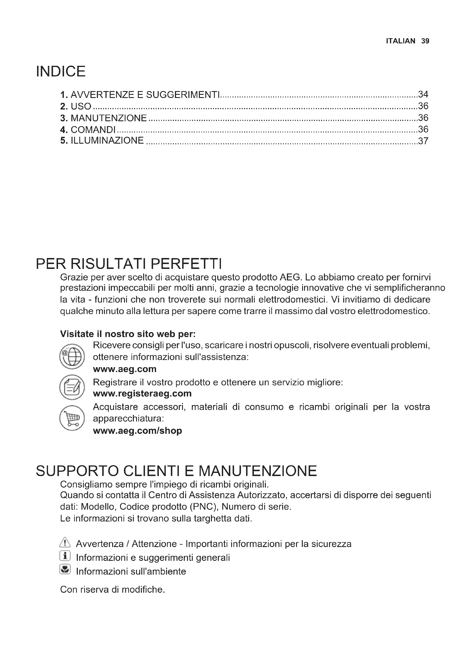 Consigliamo sempre l'impiego di ricambi originali. Quando si contatta il Centro di Assistenza Autorizzato, accertarsi di disporre dei seguenti dati: Modello, Codice prodotto (PNC), Numero di serie. Le informazioni si trovano sulla targhetta dati. Avvertenza / Attenzione - Importanti informazioni per la sicurezza Informazioni e suggerimenti generali Informazioni sull'ambiente Con riserva di modiche.40 www.aeg.com
