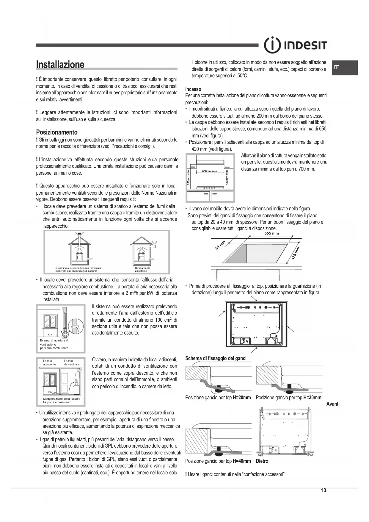 Installazione ! È importante conservare questo libretto per poterlo consultare in ogni momento. In caso di vendita, di cessione o di trasloco, assicurarsi che resti insieme all’apparecchio per informare il nuovo proprietario sul funzionamento e sui relativi avvertimenti. ! Leggere attentamente le istruzioni: ci sono importanti informazioni sull’installazione, sull’uso e sulla sicurezza. Posizionamento ! Gli imballaggi non sono giocattoli per bambini e vanno eliminati secondo le norme per la raccolta differenziata (vedi Precauzioni e consigli). ! L’installazione va effettuata secondo queste istruzioni e da personale professionalmente qualicato. Una errata installazione può causare danni a persone, animali o cose. ! Questo apparecchio può essere installato e funzionare solo in locali permanentemente ventilati secondo le prescrizioni delle Norme Nazionali in vigore. Debbono essere osservati i seguenti requisiti: