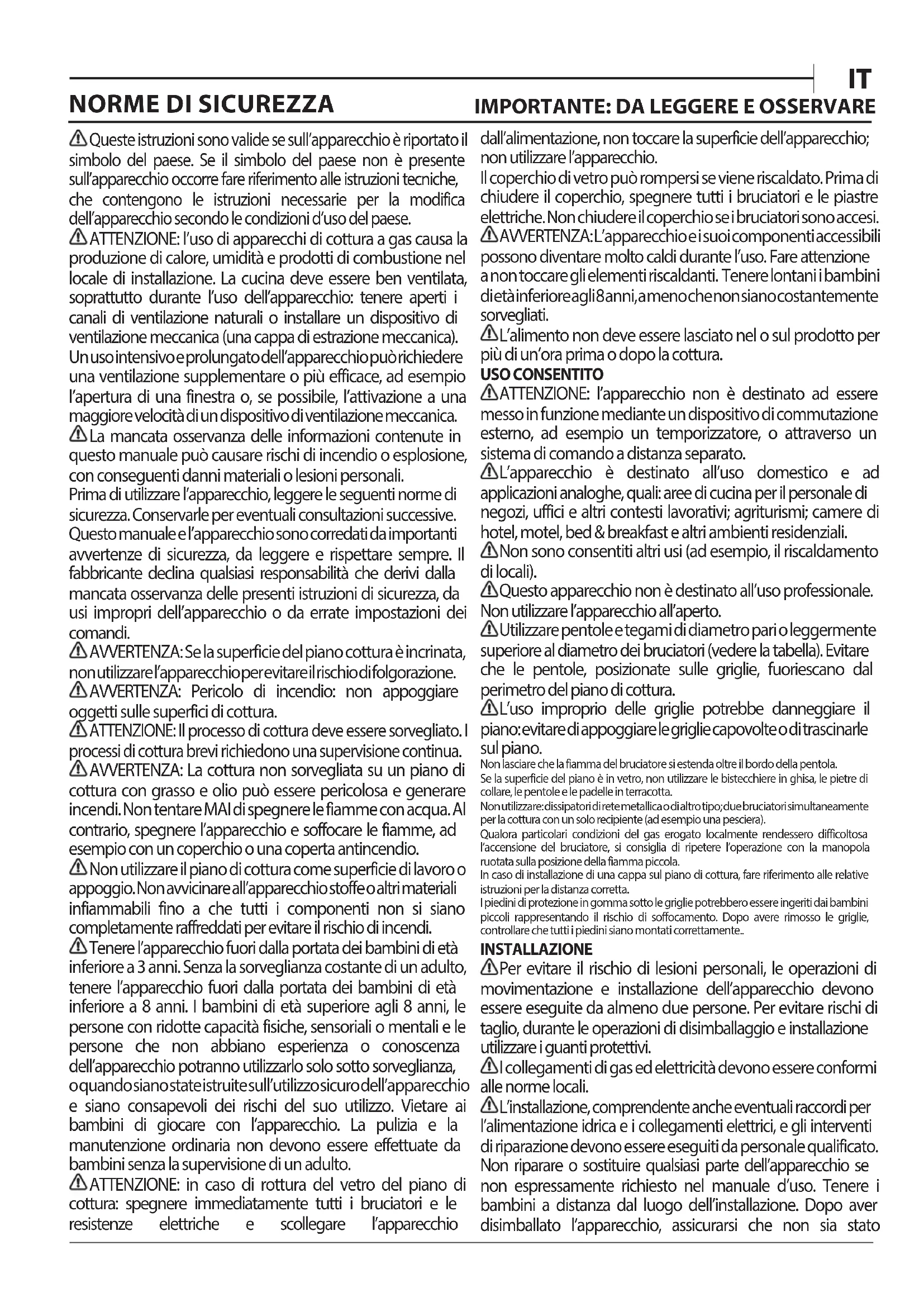 Queste istruzioni sono valide se sull’apparecchio è riportato il simbolo del paese. Se il simbolo del paese non è presente sull’apparecchio occorre fare riferimento alle istruzioni tecniche, che contengono le istruzioni necessarie per la modifica dell’apparecchio secondo le condizioni d’uso del paese. ATTENZIONE: l’uso di apparecchi di cottura a gas causa la produzione di calore, umidità e prodotti di combustione nel locale di installazione. La cucina deve essere ben ventilata, soprattutto durante l’uso dell’apparecchio: tenere aperti i canali di ventilazione naturali o installare un dispositivo di ventilazione meccanica (una cappa di estrazione meccanica). Un uso intensivo e prolungato dell’apparecchio può richiedere una ventilazione supplementare o più efficace, ad esempio l’apertura di una finestra o, se possibile, l’attivazione a una maggiore velocità di un dispositivo di ventilazione meccanica. La mancata osservanza delle informazioni contenute in questo manuale può causare rischi di incendio o esplosione, con conseguenti danni materiali o lesioni personali. Prima di utilizzare l’apparecchio, leggere le seguenti norme di sicurezza. Conservarle per eventuali consultazioni successive. Questo manuale e l’apparecchio sono corredati da importanti avvertenze di sicurezza, da leggere e rispettare sempre. Il fabbricante declina qualsiasi responsabilità che derivi dalla mancata osservanza delle presenti istruzioni di sicurezza, da usi impropri dell’apparecchio o da errate impostazioni dei comandi. AVVERTENZA: Se la superficie del piano cottura è incrinata, non utilizzare l’apparecchio per evitare il rischio di folgorazione. AVVERTENZA: Pericolo di incendio: non appoggiare oggetti sulle superfici di cottura. ATTENZIONE: Il processo di cottura deve essere sorvegliato. I processi di cottura brevi richiedono una supervisione continua. AVVERTENZA: La cottura non sorvegliata su un piano di cottura con grasso e olio può essere pericolosa e generare incendi. Non tentare MAI di spegnere le fiamme con acqua. Al contrario, spegnere l’apparecchio e soffocare le fiamme, ad esempio con un coperchio o una coperta antincendio. Non utilizzare il piano di cottura come superficie di lavoro o appoggio. Non avvicinare all’apparecchio stoffe o altri materiali infiammabili fino a che tutti i componenti non si siano completamente raffreddati per evitare il rischio di incendi. Tenere l’apparecchio fuori dalla portata dei bambini di età inferiore a 3 anni. Senza la sorveglianza costante di un adulto, tenere l’apparecchio fuori dalla portata dei bambini di età inferiore a 8 anni. I bambini di età superiore agli 8 anni, le persone con ridotte capacità fisiche, sensoriali o mentali e le persone che non abbiano esperienza o conoscenza dell’apparecchio potranno utilizzarlo solo sotto sorveglianza, o quando siano state istruite sull’utilizzo sicuro dell’apparecchio e siano consapevoli dei rischi del suo utilizzo. Vietare ai bambini di giocare con l’apparecchio. La pulizia e la manutenzione ordinaria non devono essere effettuate da bambini senza la supervisione di un adulto. ATTENZIONE: in caso di rottura del vetro del piano di cottura: spegnere immediatamente tutti i bruciatori e le resistenze elettriche e scollegare l’apparecchio dall’alimentazione, non toccare la superficie dell’apparecchio; non utilizzare l’apparecchio. Il coperchio di vetro può rompersi se viene riscaldato. Prima di chiudere il coperchio, spegnere tutti i bruciatori e le piastre elettriche. Non chiudere il coperchio se i bruciatori sono accesi. AVVERTENZA: L’apparecchio e i suoi componenti accessibili possono diventare molto caldi durante l’uso. Fare attenzione a non toccare gli elementi riscaldanti. Tenere lontani i bambini di età inferiore agli 8 anni, a meno che non siano costantemente sorvegliati. L’alimento non deve essere lasciato nel o sul prodotto per più di un’ora prima o dopo la cottura. USO CONSENTITO ATTENZIONE: l’apparecchio non è destinato ad essere messo in funzione mediante un dispositivo di commutazione esterno, ad esempio un temporizzatore, o attraverso un sistema di comando a distanza separato. L’apparecchio è destinato all’uso domestico e ad applicazioni analoghe, quali: aree di cucina per il personale di negozi, uffici e altri contesti lavorativi; agriturismi; camere di hotel, motel, bed & breakfast e altri ambienti residenziali. Non sono consentiti altri usi (ad esempio, il riscaldamento di locali). Questo apparecchio non è destinato all’uso professionale. Non utilizzare l’apparecchio all’aperto. Utilizzare pentole e tegami di diametro pari o leggermente superiore al diametro dei bruciatori (vedere la tabella). Evitare che le pentole, posizionate sulle griglie, fuoriescano dal perimetro del piano di cottura. L’uso improprio delle griglie potrebbe danneggiare il piano: evitare di appoggiare le griglie capovolte o di trascinarle sul piano. Non lasciare che la fiamma del bruciatore si estenda oltre il bordo della pentola.Se la superficie del piano è in vetro, non utilizzare le bistecchiere in ghisa, le pietre di collare, le pentole e le padelle in terracotta.Non utilizzare: dissipatori di rete metallica o di altro tipo; due bruciatori simultaneamente per la cottura con un solo recipiente (ad esempio una pesciera).Qualora particolari condizioni del gas erogato localmente rendessero difficoltosa l’accensione del bruciatore, si consiglia di ripetere l’operazione con la manopola ruotata sulla posizione della fiamma piccola.In caso di installazione di una cappa sul piano di cottura, fare riferimento alle relative istruzioni per la distanza corretta.I piedini di protezione in gomma sotto le griglie potrebbero essere ingeriti dai bambini piccoli rappresentando il rischio di soffocamento. Dopo avere rimosso le griglie, controllare che tutti i piedini siano montati correttamente.. INSTALLAZIONE Per evitare il rischio di lesioni personali, le ope