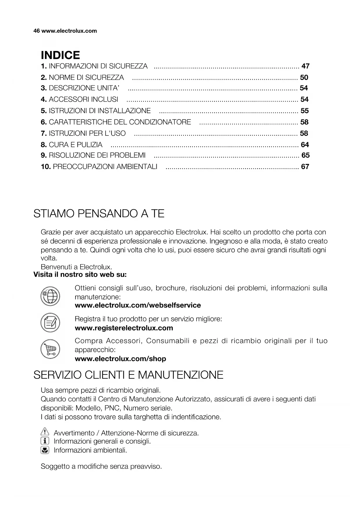 Grazie per aver acquistato un apparecchio Electrolux. Hai scelto un prodotto che porta con sé decenni di esperienza professionale e innovazione. Ingegnoso e alla moda, è stato creato pensando a te. Quindi ogni volta che lo usi, puoi essere sicuro che avrai grandi risultati ogni volta. Benvenuti a Electrolux. Usa sempre pezzi di ricambio originali. Quando contatti il Centro di Manutenzione Autorizzato, assicurati di avere i seguenti dati disponibili: Modello, PNC, Numero seriale. I dati si possono trovare sulla targhetta di indentificazione. Soggetto a modifiche senza preavviso. Avvertimento / Attenzione-Norme di sicurezza. Informazioni generali e consigli. Informazioni ambientali. Ottieni consigli sull’uso, brochure, risoluzioni dei problemi, informazioni sulla manutenzione: www.electrolux.com/webselfservice Visita il nostro sito web su: Registra il tuo prodotto per un servizio migliore: www.registerelectrolux.com Compra Accessori, Consumabili e pezzi di ricambio originali per il tuo apparecchio: www.electrolux.com/shop INDICE