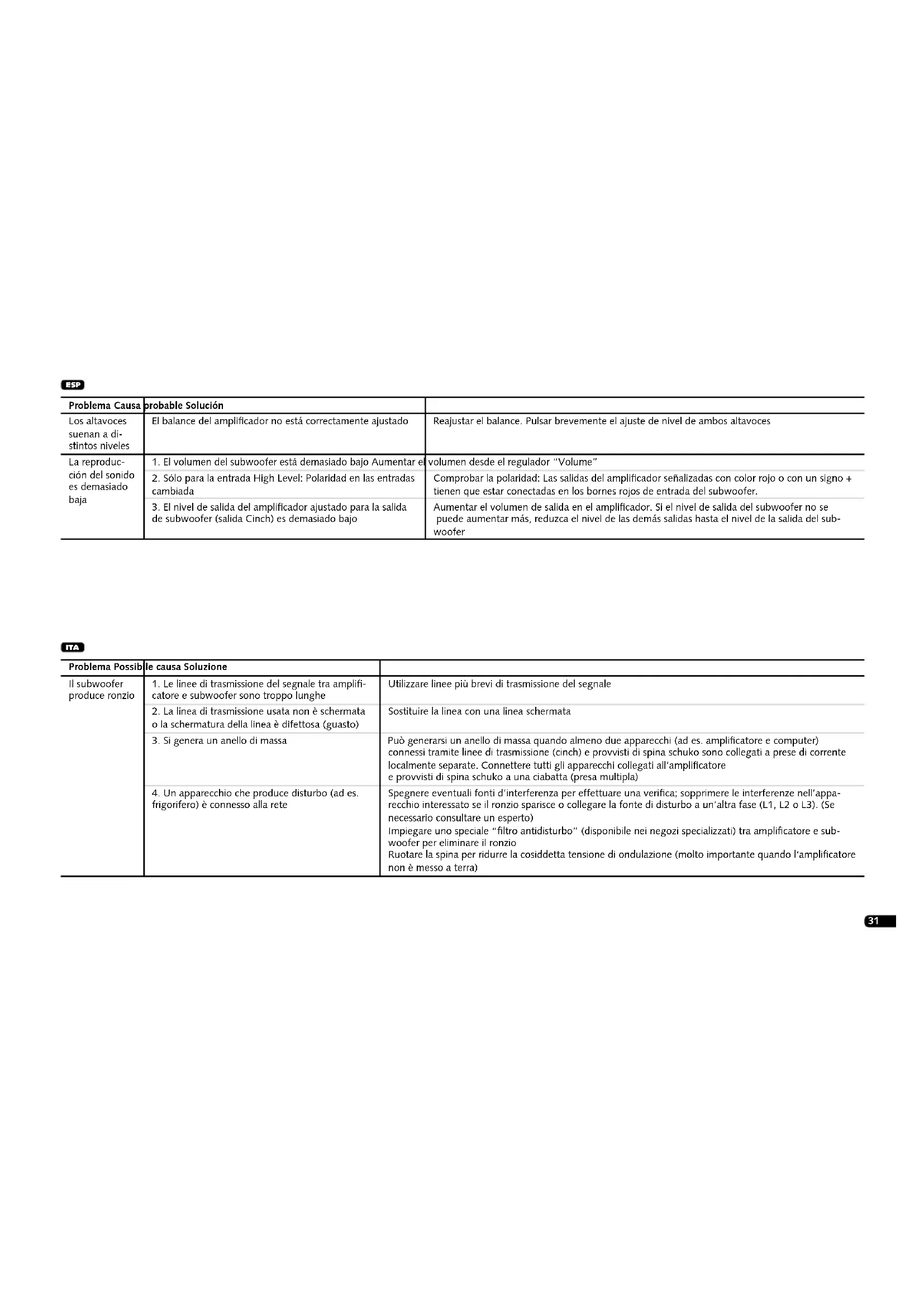 frigorifero) è connesso alla rete Spegnere eventuali fonti d’interferenza per effettuare una verifica; sopprimere le interferenze nell’appa- recchio interessato se il ronzio sparisce o collegare la fonte di disturbo a un’altra fase (L1, L2 o L3). (Se necessario consultare un esperto) Impiegare uno speciale “ltro antidisturbo” (disponibile nei negozi specializzati) tra amplicatore e sub- woofer per eliminare il ronzio Ruotare la spina per ridurre la cosiddetta tensione di ondulazione (molto importante quando l‘amplificatore non è messo a terra) ITA32 ITA Problema Possibile causa Soluzione I diffusori riprodu- cono i suoni con potenze diverse Impostazione errata del livello dell’amplificatore Correggere il livello dell’amplificatore (a tal scopo consultare le istruzioni d’uso dell’apparecchio) Il volume della riproduzione è troppo basso