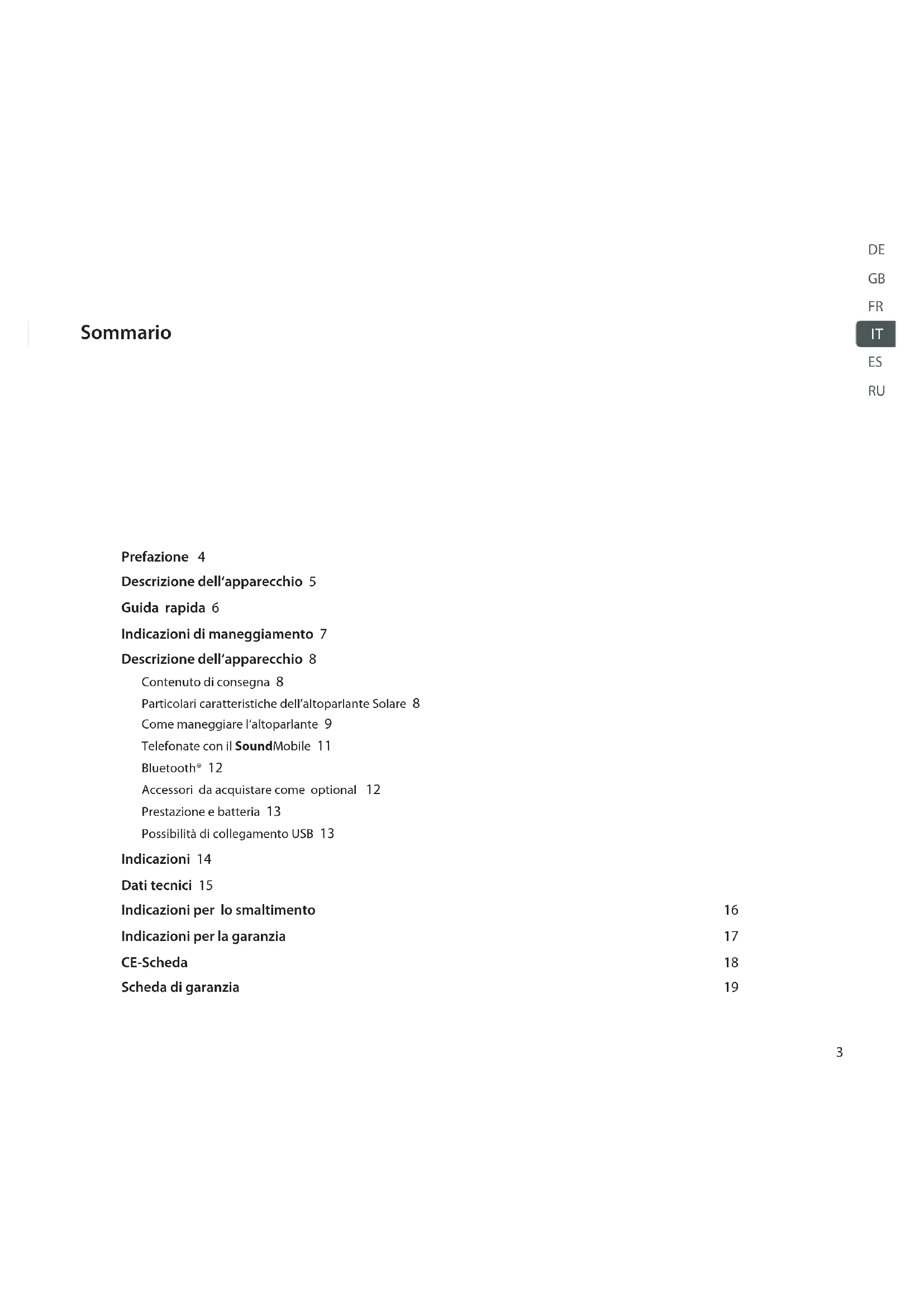water resistant3 Prefazione 4 Descrizione dell‘apparecchio 5 Guida rapida 6 Indicazioni di maneggiamento 7 Descrizione dell‘apparecchio 8 Contenuto di consegna 8 Particolari caratteristiche dell’altoparlante Solare 8 Come maneggiare l‘altoparlante 9 Telefonate con il SoundMobile 11 Bluetooth® 12 Accessori da acquistare come optional 12 Prestazione e batteria 13 Possibilità di collegamento USB 13 Indicazioni 14 Dati tecnici 15 Indicazioni per lo smaltimento 16 Indicazioni per la garanzia 17 CE-Scheda 18 Scheda di garanzia 19 Sommario