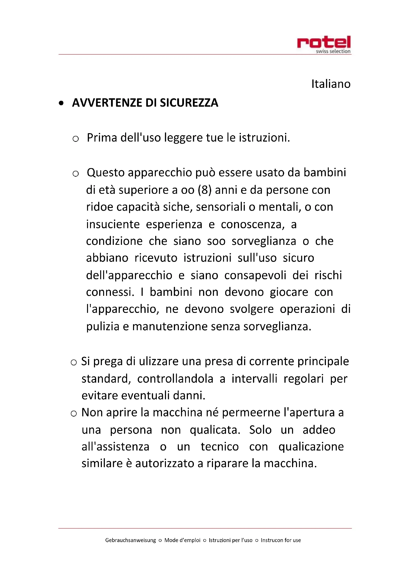 o Prima dell'uso leggere tutte le istruzioni. o Questo apparecchio può essere usato da bambini di età superiore a otto (8) anni e da persone con ridotte capacità fisiche, sensoriali o mentali, o con insufficiente esperienza e conoscenza, a condizione che siano sotto sorveglianza o che abbiano ricevuto istruzioni sull'uso sicuro dell'apparecchio e siano consapevoli dei rischi connessi. I bambini non devono giocare con l'apparecchio, ne devono svolgere operazioni di pulizia e manutenzione senza sorveglianza. o Si prega di utilizzare una presa di corrente principale standard, controllandola a intervalli regolari per evitare eventuali danni. o Non aprire la macchina né permetterne l'apertura a una persona non qualificata. Solo un addetto all'assistenza o un tecnico con qualificazione similare è autorizzato a riparare la macchina.Gebrauchsanweisung ○ Mode d’emploi ○ Istruzioni per l’uso ○ Instruction for use o Controllare il cavo di alimentazione e la spina. Se il cavo di alimentazione è danneggiato, non usare la macchina. Non estrarre la spina con le mani umide. o Non usare prolunghe del cavo di alimentazione e utilizzare unicamente la presa di corrente principale. o Se la macchina è rimasta inutilizzata a lungo, accenderla prima per 10 minuti per consolidare i componenti elettronici. Dopodiché, si può procedere al normale funzionamento. o Non usare la macchina vicino ad acqua, fuoco o zone con vapore. La macchina è progettata ESCLUSIVAMENTE per l'utilizzo in ambienti interni. o Posizionare la macchina ESCLUSIVAMENTE su una superficie piana e solida. o Tenere sotto controllo i bambini per assicurarsi che non giochino con la macchina. o Non posizionare nessuno dei seguenti oggetti sul pannello quando la macchina è in uso. Acciaio inox Ferro Ghisa Alluminio Coperchio e smalto Coltelli, forchette e cucchiaiGebrauchsanweisung ○ Mode d’emploi ○ Istruzioni per l’uso ○ Instruction for use La piastra è composta di ferro, acciaio inox, ghisa o alluminio Utensili di cottura vuoti o Non trasportare o muovere la macchina con utensili di cottura posizionati sulla piastra durante il riscaldamento. o Mantenere un ampio spazio circostante per garantire la ventilazione durante il riscaldamento. o Non inserire fili o oggetti metallici nell'entrata d'aria o nell'uscita di ventilazione della macchina. o Cura del pannello Non far cadere oggetti pesanti sul pannello. Non versare acqua, acido o altri liquidi sul pannello. Non bruciare alcun oggetto con fiamma viva sul pannello Non posizionare utensili di cottura bollenti sulla piastra quando la macchina non è in uso. Se la superficie (il pannello) presenta fessure, spegnere immediatamente la macchina per evitare scosse elettriche e inviarla al centro di riparazione. Alcuni utensili di cottura possono dare luogo a rumori durante l'uso. Muovere leggermenteGebrauchsanweisung ○ Mode d’emploi ○ Istruzioni per l’uso ○ Instruction for use l'utensile di cottura e il rumore può cessare o ridursi. In caso contrario, cambiarlo. o Non posizionare la macchina su tappeti, vestiti o carta quando la macchina è in uso. o Non toccare il pannello dopo l'uso. Il riscaldatore elettrico di ceramica è ancora bollente persino quando la corrente è spenta. o Non scollegare la macchina dalla spina tirando dal cavo. o Spegnere la macchina prima di togliere la spina. Scollegare il cavo di alimentazione dalla presa di corrente quando si prevede di lasciare la macchina inutilizzata per lunghi periodi di tempo. o Mantenere gli utensili di cottura lontani dalla macchina dopo l'uso.Gebrauchsanweisung ○ Mode d’emploi ○ Istruzioni per l’uso ○ Instruction for use FUNZIONAMENTO ON/OFF o Inserire la spina nella presa e premere il tasto ON/OFF. La macchina è in modalità stand-by quando la spia LED è accesa. o Collocare un utensile di cottura al centro della zona di cottura. Premere Riscaldare/friggere per scegliere una delle funzioni: si accenderà la spia corrispondente. o Premere il tasto ON/OFF per spegnere la macchina. RISCALDARE/FRIGGERE o Premere il tasto Riscaldare/friggere per scegliere tra le modalità "Riscaldare" e "Friggere". o Premendo il tasto Riscaldare/friggere una prima volta si entrerà nella modalità "Riscalda" e si accenderà la spia di accensione (W). Regolare il livello di potenza facendo scorrere un dito sulla barra da sinistra verso destra (da 60W a 1800W) o da destra verso sinistra (da 1800W a 60W). o Premere nuovamente il tasto Riscaldare/friggere, questa volta sarà nella modalità "Friggere" e si accenderà la spia della temperatura (℃). Regolare la temperatura facendo scorrere un dito sulla barra da sinistra verso destra (da 80 ℃ a 240 ℃) o da destra verso sinistra (da 240 ℃ a 80 ℃). TIMER o Premere il tasto Timer per impostare il timer, quindi selezionare la modalità Riscaldare o Friggere. o Regolare l'ora del timer tra 1 e 24 ore facendo scorrere un dito sulla prima metà della barra. Regolare i minuti del timer tra 1 e 59 minuti facendo scorrere un dito sulla seconda metà della barra. o Il timer inizierà il conto alla rovescia quando il tempo visualizzato smette di lampeggiare. o La durata massima del timer è di 24 ore.