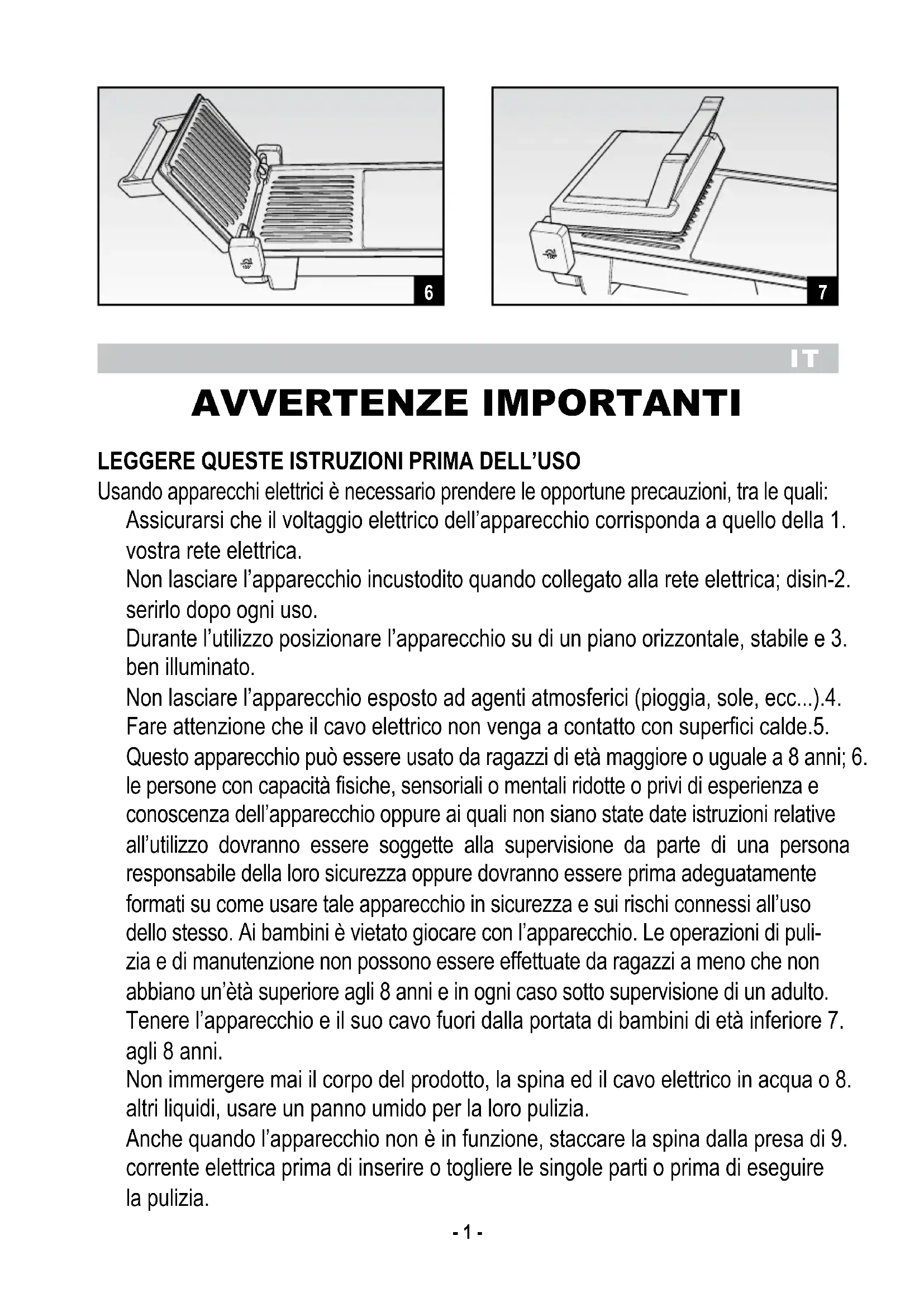 Usando apparecchi elettrici è necessario prendere le opportune precauzioni, tra le quali: Assicurarsi che il voltaggio elettrico dell’apparecchio corrisponda a quello della 1. vostra rete elettrica. Non lasciare l’apparecchio incustodito quando collegato alla rete elettrica; disin-2. serirlo dopo ogni uso. Durante l’utilizzo posizionare l’apparecchio su di un piano orizzontale, stabile e 3. ben illuminato. Non lasciare l’apparecchio esposto ad agenti atmosferici (pioggia, sole, ecc...).4. Fare attenzione che il cavo elettrico non venga a contatto con superfici calde.5. Questo apparecchio può essere usato da ragazzi di età maggiore o uguale a 8 anni; 6. le persone con capacità fisiche, sensoriali o mentali ridotte o privi di esperienza e conoscenza dell’apparecchio oppure ai quali non siano state date istruzioni relative all’utilizzo dovranno essere soggette alla supervisione da parte di una persona responsabile della loro sicurezza oppure dovranno essere prima adeguatamente formati su come usare tale apparecchio in sicurezza e sui rischi connessi all’uso dello stesso. Ai bambini è vietato giocare con l’apparecchio. Le operazioni di puli- zia e di manutenzione non possono essere effettuate da ragazzi a meno che non abbiano un’ètà superiore agli 8 anni e in ogni caso sotto supervisione di un adulto. Tenere l’apparecchio e il suo cavo fuori dalla portata di bambini di età inferiore 7. agli 8 anni. Non immergere mai il corpo del prodotto, la spina ed il cavo elettrico in acqua o 8. altri liquidi, usare un panno umido per la loro pulizia. Anche quando l’apparecchio non è in funzione, staccare la spina dalla presa di 9. corrente elettrica prima di inserire o togliere le singole parti o prima di eseguire la pulizia. 180° 180°