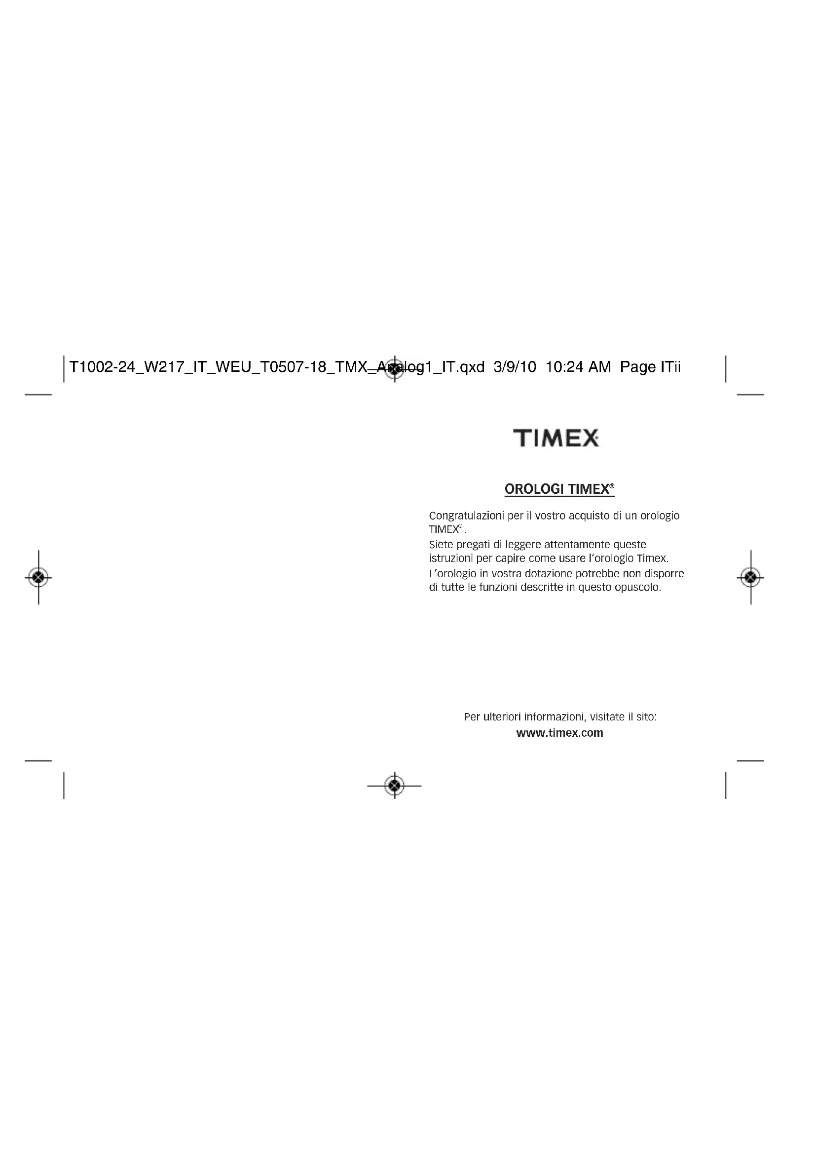 Siete pregati di leggere attentamente queste istruzioni per capire come usare l’orologio Timex. L’orologio in vostra dotazione potrebbe non disporre di tutte le funzioni descritte in questo opuscolo. Per ulteriori informazioni, visitate il sito: www.timex.com T1002-24_W217_IT_WEU_T0507-18_TMX_Analog1_IT.qxd 3/9/10 10:24 AM Page ITiiINDICE ANALITICO 86 Come avviare l’orologio 87 Resistenza all’acqua e agli urti 88 Illuminazione del quadrante Indiglo