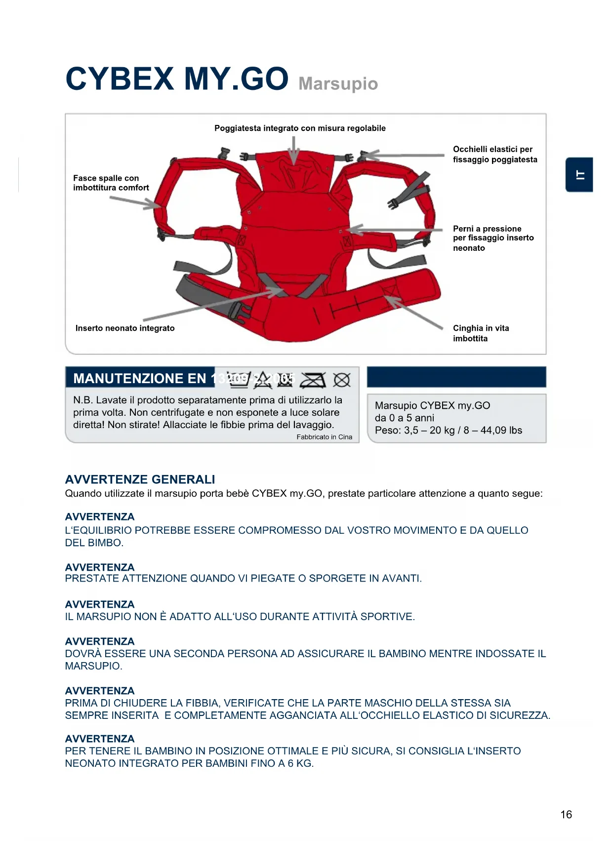 AVVERTENZE GENERALI AVVERTENZA AVVERTENZA AVVERTENZA AVVERTENZA AVVERTENZA AVVERTENZA L‘EQUILIBRIO POTREBBE ESSERE COMPROMESSO DAL VOSTRO MOVIMENTO E DA QUELLO DEL BIMBO.DOVRÀ ESSERE UNA SECONDA PERSONA AD ASSICURARE IL BAMBINO MENTRE INDOSSATE IL MARSUPIO.PRIMA DI CHIUDERE LA FIBBIA, VERIFICATE CHE LA PARTE MASCHIO DELLA STESSA SIA SEMPRE INSERITA E COMPLETAMENTE AGGANCIATA ALL‘OCCHIELLO ELASTICO DI SICUREZZA.PER TENERE IL BAMBINO IN POSIZIONE OTTIMALE E PIÙ SICURA, SI CONSIGLIA L‘INSERTO NEONATO INTEGRATO PER BAMBINI FINO A 6 KG.PRESTATE ATTENZIONE QUANDO VI PIEGATE O SPORGETE IN AVANTI.IL MARSUPIO NON È ADATTO ALL‘USO DURANTE ATTIVITÀ SPORTIVE.Quando utilizzate il marsupio porta bebè CYBEX my.GO, prestate particolare attenzione a quanto segue:Fabbricato in CinaFasce spalle con imbottitura comfortPoggiatesta integrato con misura regolabileOcchielli elastici per ssaggio poggiatesta Perni a pressione per ssaggio inserto neonatoCinghia in vita imbottita Inserto neonato integrato IT17