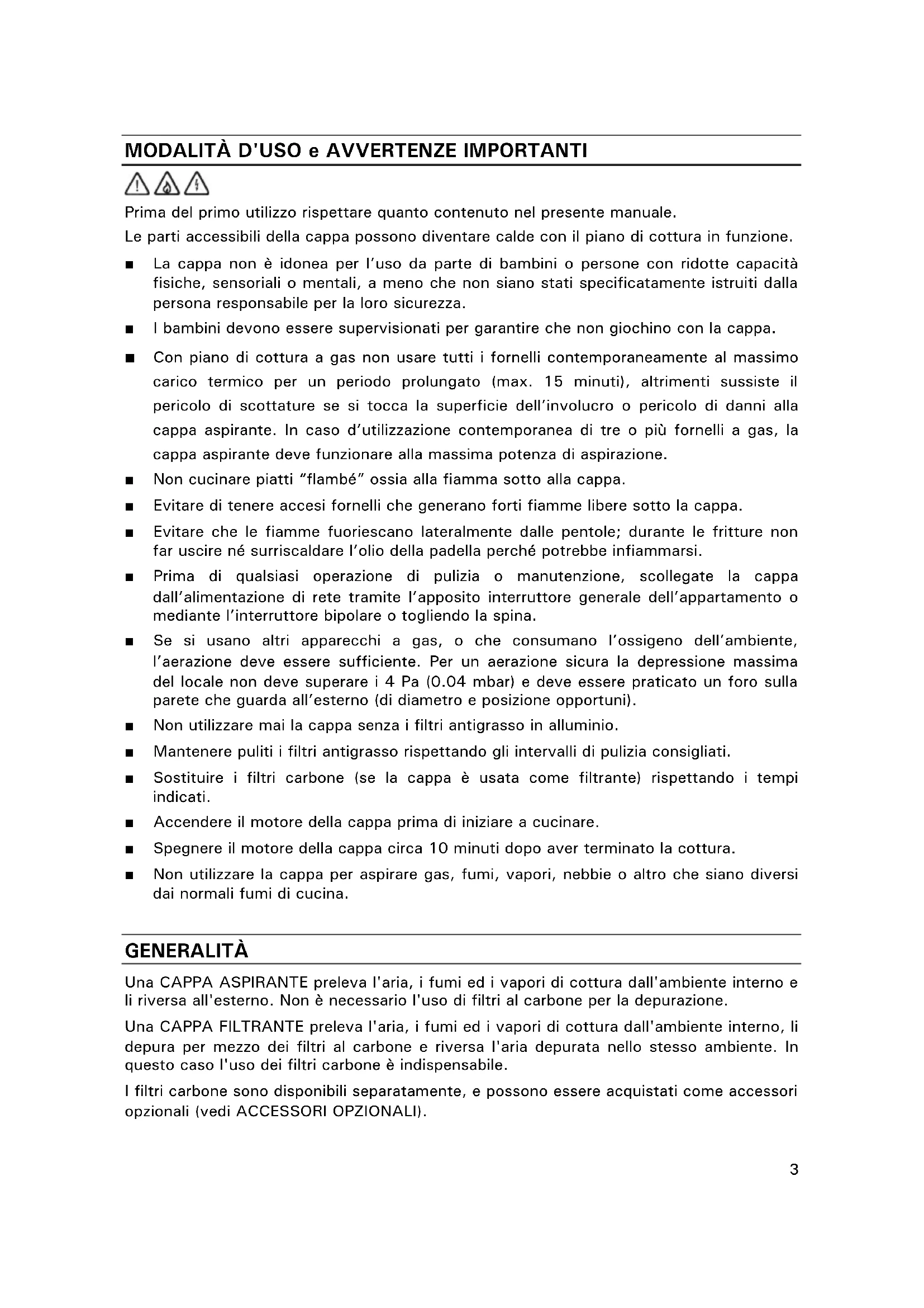 La ditta costruttrice vieta all'utente di collegare l'eventuale scarico d'aria della cappa, usata come aspirante, a camini di caldaie di evacuatione gas, fumi o vapori od a qualsiasi altra conduttura,anche solo di aerazione,che è stata,o sare usata per altri scopi o per altri apparecchi a combustione di gas o altri combustibili.