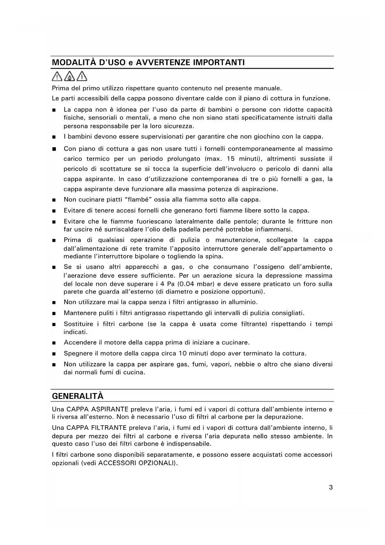 MODALITÀ D'USO e AVVERTENZE IMPORTANTI Prima del primo utilizzo rispettare quanto contenuto nel presente manuale. Le parti accessibili della cappa possono diventare calde con il piano di cottura in funzione. ■ La cappa non è idonea per l’uso da parte di bambini o persone con ridotte capacità fisiche, sensoriali o mentali, a meno che non siano stati specificatamente istruiti dalla persona responsabile per la loro sicurezza. ■ I bambini devono essere supervisionati per garantire che non giochino con la cappa. ■ Con piano di cottura a gas non usare tutti i fornelli contemporaneamente al massimo carico termico per un periodo prolungato (max. 15 minuti), altrimenti sussiste il pericolo di scottature se si tocca la superficie dell’involucro o pericolo di danni alla cappa aspirante. In caso d’utilizzazione contemporanea di tre o più fornelli a gas, la cappa aspirante deve funzionare alla massima potenza di aspirazione. ■ Non cucinare piatti “flambé” ossia alla fiamma sotto alla cappa. ■ Evitare di tenere accesi fornelli che generano forti fiamme libere sotto la cappa. ■ Evitare che le fiamme fuoriescano lateralmente dalle pentole; durante le fritture non far uscire né surriscaldare l’olio della padella perché potrebbe infiammarsi. ■ Prima di qualsiasi operazione di pulizia o manutenzione, scollegate la cappa dall’alimentazione di rete tramite l’apposito interruttore generale dell’appartamento o mediante l’interruttore bipolare o togliendo la spina. ■ Se si usano altri apparecchi a gas, o che consumano l’ossigeno dell’ambiente, l’aerazione deve essere sufficiente. Per un aerazione sicura la depressione massima del locale non deve superare i 4 Pa (0.04 mbar) e deve essere praticato un foro sulla parete che guarda all’esterno (di diametro e posizione opportuni). ■ Non utilizzare mai la cappa senza i filtri antigrasso in alluminio. ■ Mantenere puliti i filtri antigrasso rispettando gli intervalli di pulizia consigliati. ■ Sostituire i filtri carbone (se la cappa è usata come filtrante) rispettando i tempi indicati. ■ Accendere il motore della cappa prima di iniziare a cucinare. ■ Spegnere il motore della cappa circa 10 minuti dopo aver terminato la cottura. ■ Non utilizzare la cappa per aspirare gas, fumi, vapori, nebbie o altro che siano diversi dai normali fumi di cucina. GENERALITÀ Una CAPPA ASPIRANTE preleva l'aria, i fumi ed i vapori di cottura dall'ambiente interno e li riversa all'esterno. Non è necessario l'uso di filtri al carbone per la depurazione. Una CAPPA FILTRANTE preleva l'aria, i fumi ed i vapori di cottura dall'ambiente interno, li depura per mezzo dei filtri al carbone e riversa l'aria depurata nello stesso ambiente. In questo caso l'uso dei filtri carbone è indispensabile. I filtri carbone sono disponibili separatamente, e possono essere acquistati come accessori opzionali (vedi ACCESSORI OPZIONALI).4