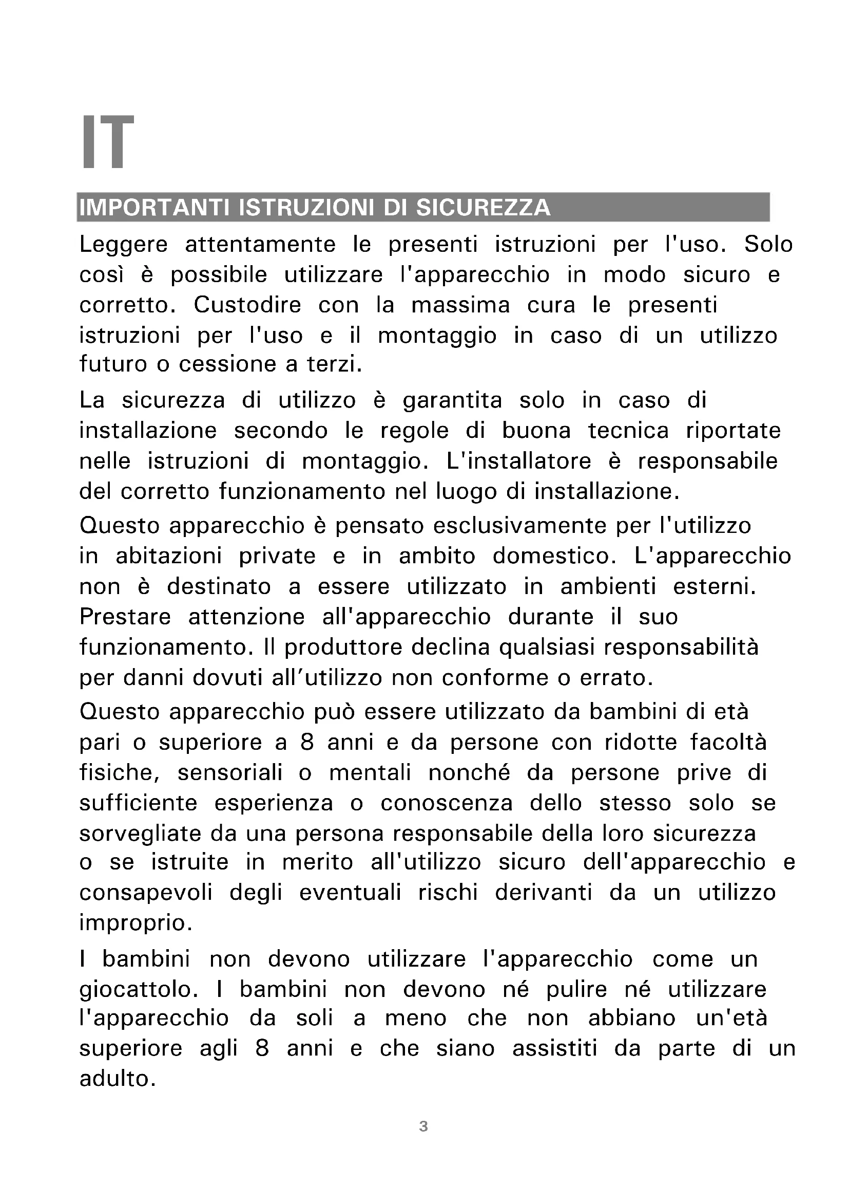 Leggere attentamente le presenti istruzioni per l'uso. Solo così è possibile utilizzare l'apparecchio in modo sicuro e corretto. Custodire con la massima cura le presenti istruzioni per l'uso e il montaggio in caso di un utilizzo futuro o cessione a terzi. La sicurezza di utilizzo è garantita solo in caso di installazione secondo le regole di buona tecnica riportate nelle istruzioni di montaggio. L'installatore è responsabile del corretto funzionamento nel luogo di installazione. Questo apparecchio è pensato esclusivamente per l'utilizzo in abitazioni private e in ambito domestico. L'apparecchio non è destinato a essere utilizzato in ambienti esterni. Prestare attenzione all'apparecchio durante il suo funzionamento. Il produttore declina qualsiasi responsabilità per danni dovuti all’utilizzo non conforme o errato. Questo apparecchio può essere utilizzato da bambini di età pari o superiore a 8 anni e da persone con ridotte facoltà fisiche, sensoriali o mentali nonché da persone prive di sufficiente esperienza o conoscenza dello stesso solo se sorvegliate da una persona responsabile della loro sicurezza o se istruite in merito all'utilizzo sicuro dell'apparecchio e consapevoli degli eventuali rischi derivanti da un utilizzo improprio. I bambini non devono utilizzare l'apparecchio come un giocattolo. I bambini non devono né pulire né utilizzare l'apparecchio da soli a meno che non abbiano un'età superiore agli 8 anni e che siano assistiti da parte di un adulto.4 Tenere lontano dall'apparecchio e dal cavo di alimentazione i bambini di età inferiore agli 8 anni. Controllare l'apparecchio dopo averlo disimballato. Qualora si fossero verificati danni da trasporto, non collegare l'apparecchio. L'allacciamento senza spina dell'apparecchio può essere effettuato solo da un tecnico autorizzato. In caso di danni causati da un allacciamento non corretto, decade il diritto di garanzia. Pericolo di soffocamento! Il materiale d'imballaggio è pericoloso per i bambini. Non lasciare mai che i bambini giochino con il materiale di imballaggio. Pericolo di morte! I gas di combustione riaspirati possono causare avvelenamento. È necessario assicurare sempre un'alimentazione di aria sufficiente quando l'apparecchio in modalità aspirazione viene utilizzato contemporaneamente a un focolare dipendente dall'aria ambiente. I focolari che dipendono dall'aria ambiente (per es. a gas, olio, legna o carbone, scaldabagno, caldaie elettriche) ricavano l'aria per la combustione dalla stanza ed eliminano i gas di scarico all'esterno attraverso un impianto (per es. camino). In concomitanza della cappa accesa, dalla cucina e dalle stanze adiacenti viene sottratta dell'aria: senza un'alimentazione sufficiente di aria si crea depressione. I5 gas velenosi dal camino o dalla cappa di aspirazione vengono riaspirati nelle stanze.