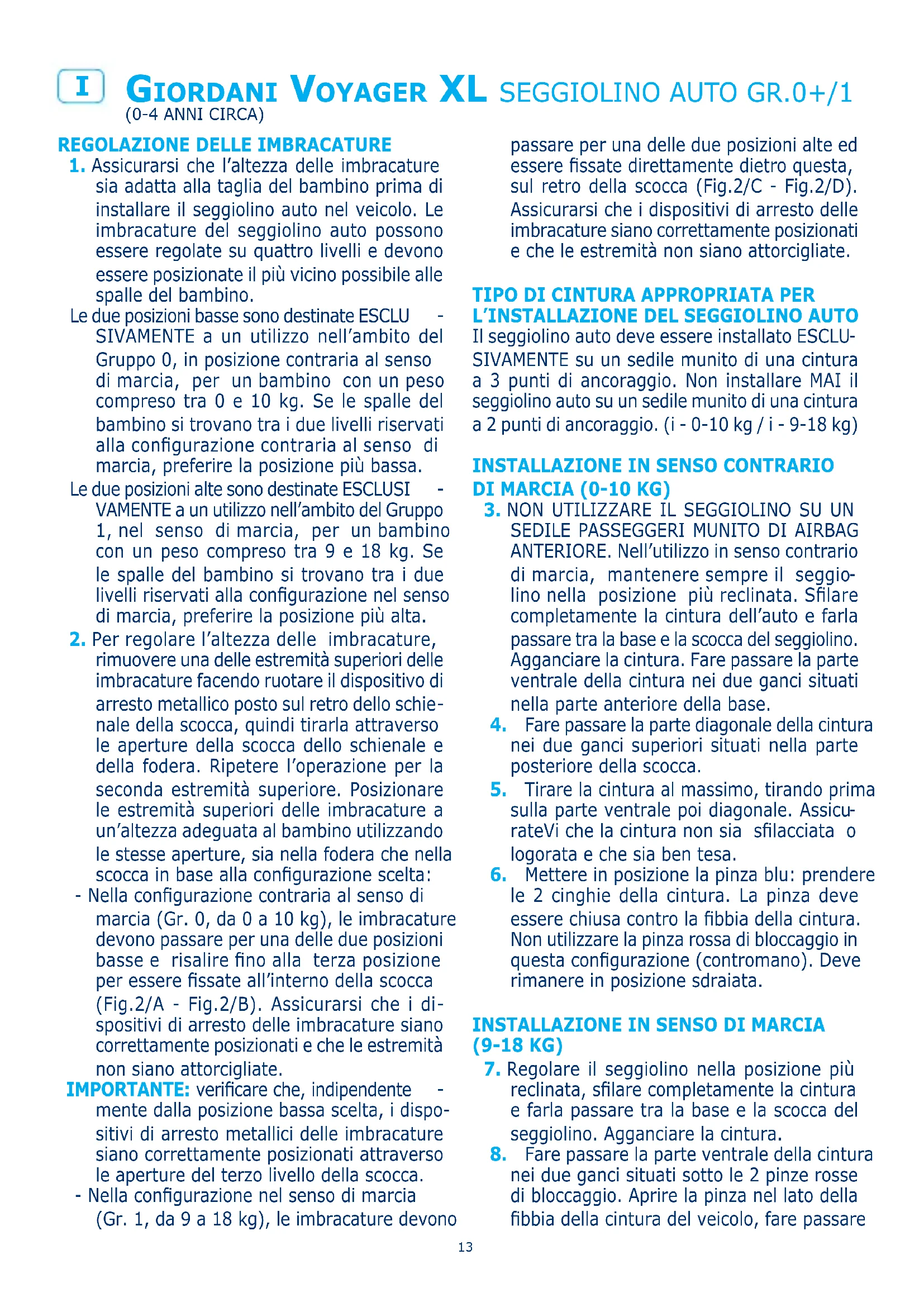 Scarica le istruzioni per il tuo Seggiolino auto in formato PDF gratuitamente! Trova il tuo manuale Voyager - Giordani e riprendi in mano il tuo dispositivo elettronico. In questa pagina sono pubblicati tutti i documenti necessari per l'utilizzo del tuo dispositivo. Voyager del marchio Giordani.