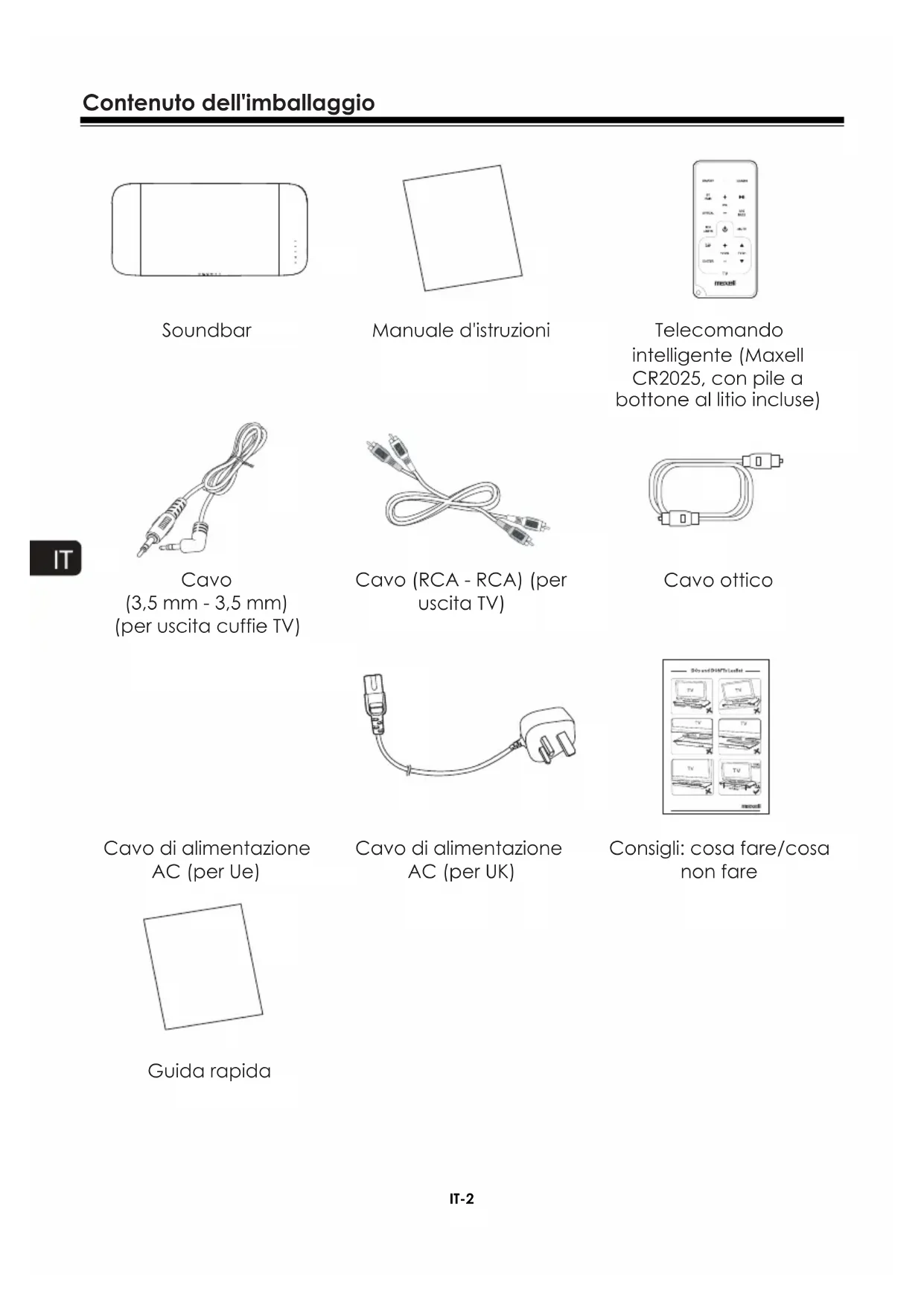 1 Terminale OPTICAL - 1 jack d'ingresso ottico. 2 Terminali RCA - Ingresso standard RCA audio, rosso / bianco. 3 Terminali LINE IN - Jack d'ingresso audio 3,5 mm standard. 4 Spina di alimentazione CA~ - Consente di collegare il cavo di alimentazione CA. Telecomando intelligente 1 AVVIO/ARRESTO - Permette di attivare o disattivare l'unità 2 ACCOPPIAMENTO BLUETOOTH - Consente di selezionare la modalità Bluetooth - Accoppia l'unità in modalità Bluetooth 3 VOL+ /- (Volume) - Consente di regolare il volume 4 Optical - Consente di selezionare l'ingresso Ottico come sorgente audio. 5 RCA/LINE IN Consente di selezionare l'ingresso RCA o LINE IN. 6 Zona modalità apprendimento TV - Consente di memorizzare certe funzioni del telecomando TV sul telecomando intelligente. (Per maggiori dettagli, v. p. 12) 7 SPIA DELLA MODALITÀ APPRENDIMENTO (LEARN). - Avvio: modalità apprendimento attivata - Arresto: modalità apprendimento disattivata (Per maggiori dettagli, v. p. 12) 8 APPRENDIMENTO - Consente di attivare la modalità di apprendimento per configurare il telecomando e controllare determinate funzioni del televisore. 9 PAUSA/LETTURA - Per mettere in pausa/riprendere la lettura in modalità BT 10 SRS/BASSI - Consente di selezionare il potenziamento dei bassi, livello 1, 2 o l'effetto SRS WOW HD. 11 MODALITÀ MUTO - Per eliminare o ripristinare l'audio dell'unità. ITUtilizzo IT-7 Preparazione del telecomando intelligente Il telecomando intelligente in dotazione consente di attivare l'unità a distanza. Anche se il telecomando intelligente è utilizzato all'interno della zona di efficacia (60 m), potrebbe non funzionare in presenza di ostacoli tra questo e l'unità. Se il telecomando intelligente viene utilizzato in prossimità di altri prodotti che generano raggi infrarossi, o se altri dispositivi di controllo a distanza che impiegano raggi infrarossi sono utilizzati vicino all'apparecchio, il telecomando potrebbe non funzionare correttamente. Viceversa, gli altri prodotti potrebbero non funzionare correttamente. Durante il primo utilizzo: L'unità ha una batteria al litio CR2025 preinstallata. Togliere la linguetta di protezione per attivare la batteria del telecomando. Per sostituire la batteria del telecomando intelligente: (A) : premere sull'attacco verso sinistra. (B) : tirare lo sportello del vano batteria ed estrarre la pila scarica. (C) : posizionare una pila CR2025 nuova nel vano batteria rispettando la polarità (+ / -) indicata. (D) : inserire lo sportello nel relativo alloggiamento. Precauzioni relative alle pile Se il telecomando intelligente non viene usato per lunghi periodi (superiori a un mese), estrarre la batteria per evitare fuoriuscite. In tal caso, asciugare l'interno del vano batteria e sostituire la pila con una nuova. Non utilizzare pile diverse da quelle indicate. Non scaldare né smontare le pile. Non gettarle mai nel fuoco o in acqua. Non trasportare o conservare le pile con altri oggetti metallici perché potrebbero verificarsi cortocircuiti, fuoriuscite o esplosioni delle pile. Ricaricare la pila solo se viene indicato che si tratta di pila ricaricabile.Connessioni IT-8 Installazione di un televisore sull'apparecchio La soundbar Maxell MXSB-252BT è stata concepita per essere utilizzata con televisori di peso non superiore a 50 kg e con base e profondità inferiori a 53cm e 30 cm rispettivamente. La soundbar MXSB-252BT può essere impiegata con la maggior parte dei televisori da 42”. Non è possibile, tuttavia, posizionare schermi a tubo catodico (CRT) sul sistema, perché quest'ultimo non è stato concepito per essere utilizzato con simili tipologie di televisore. Per l'installazione corretta dell'unità, attenersi ai consigli riportati nella sezione relativa a "Cosa fare" e "Cosa non fare". Avvertenza: abbassare il volume del televisore o di altre sorgenti audio prima di eseguire i collegamenti, perché si potrebbe generare improvvisamente un volume sonoro elevato. Connessione all'alimentazione Avvertenza! Rischio di danno al prodotto! - Assicurarsi che la tensione nominale della presa di corrente corrisponda a quella indicata sul retro o sulla parte inferiore dell'apparecchio. - Rischio di scosse elettriche! Scollegare il cavo di alimentazione, tirando la spina. Non tirare mai il cavo. - Assicurarsi che venga utilizzato il cavo di alimentazione appropriato.
