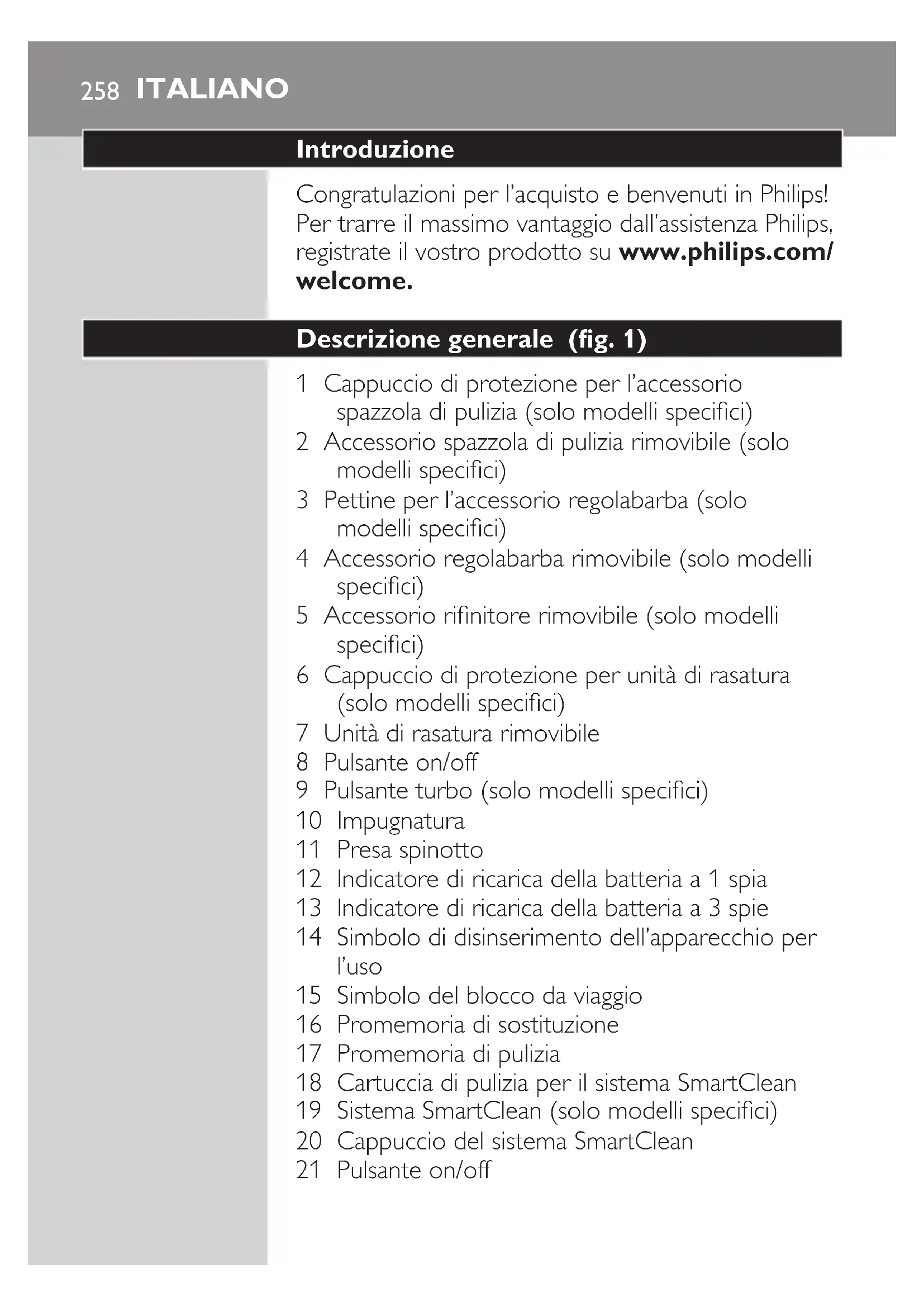 Tenete premuto il pulsante on/off per 3 secondi. - Il simbolo del blocco da viaggio lampeggia e quindi si accende sso. Il rasoio è di nuovo pronto per l’uso. Sostituzione delle testine di rasatura Per ottenere prestazioni di rasatura ottimali, vi consigliamo di sostituire le testine di rasatura ogni due anni. - L’apparecchio è dotato di un promemoria di sostituzione per ricordarvi di sostituire le testine di rasatura. Il promemoria di sostituzione si accende a luce ssa. Nota: dopo aver sostituito le testine di rasatura, ripristinate il promemoria di sostituzione premendo il pulsante on/off per 7 secondi. Impostazioni Turbo (solo modelli specici) L’apparecchio è dotato dell’impostazione Turbo o Turbo+. Tale impostazione offre una rasatura più rapida e accurata anche delle zone più difcili da raggiungere. 3 sec. ITALIANO 265Attivazione dell’impostazione Turbo 1 Per attivare l’impostazione Turbo, premete una volta il pulsante turbo. Disattivazione dell’impostazione Turbo 1 Per disattivare l’impostazione Turbo, premete di nuovo il pulsante turbo. Come ricaricare l’apparecchio La ricarica richiede circa 1 ora. Nota: questo apparecchio può essere utilizzato solo senza lo. Il rasoio deve essere caricato prima di utilizzarlo per la prima volta e quando il display indica che la batteria è quasi scarica. Carica tramite adattatore 1 Inserite lo spinotto nella presa dell’apparecchio e l’adattatore nella presa di corrente. Ricarica tramite sistema SmartClean (solo per modelli specici) 1 Collegate lo spinotto al sistema SmartClean. 2 Inserite la spina dell’adattatore nella presa di corrente a muro. ITALIANO2663 Premete il coperchio superiore per inserire il rasoio nel supporto no a farlo scattare in posizione. 4 Tenete il rasoio elettrico capovolto sopra il supporto. Assicuratevi che la parte anteriore del rasoio sia rivolta verso il sistema SmartClean. 5 Posizionate il rasoio nel supporto, inclinate il rasoio all’indietro e premete verso il basso il coperchio superiore per collegare il rasoio no a farlo scattare in posizione. - Il simbolo della batteria lampeggia lentamente a indicare che il rasoio è in fase di ricarica. Modalità d’uso del rasoio Accensione e spegnimento dell’apparecchio 1 Per accendere l’apparecchio, premete una volta il pulsante on/off. 2 Per spegnere l’apparecchio, premete una volta il pulsante on/off. - Indicatore di ricarica della batteria a 3 spie: il display si illumina per alcuni secondi per visualizzare l’autonomia residua della batteria. ITALIANO 267Rasatura Periodo di adattamento sulla pelle Le prime rasature potrebbero non avere il risultato che vi aspettate e la vostra pelle potrebbe anche irritarsi un po’. Questo è normale. La pelle e la barba hanno bisogno di tempo per adattarsi a qualunque nuovo sistema di rasatura. Vi consigliamo una rasatura regolare (almeno 3 volte a settimana) utilizzando questo rasoio per un periodo di 3 settimane per consentire alla pelle di adattarsi al nuovo rasoio. Nota: questo apparecchio può essere utilizzato solo senza lo. 1 Accendete l’apparecchio. 2 Fate scorrere le testine di rasatura sulla pelle, compiendo movimenti circolari. Nota: non fate movimenti lineari. 3 Pulite il rasoio dopo ogni uso (vedere il capitolo “Pulizia e manutenzione”). Rasatura su pelle bagnata Potete usare questo rasoio anche sotto la doccia o sul volto ricoperto di schiuma da barba o gel per la rasatura. Per radersi con la schiuma da barba o il gel per la rasatura, seguite i passaggi riportati sotto: 1 Bagnate la pelle. 2 Applicate quindi la schiuma da barba o il gel per la rasatura. ITALIANO2683 Bagnate l’unità di rasatura sotto il rubinetto per fare in modo che l’unità di rasatura scorra facilmente sulla vostra pelle. 4 Accendete il rasoio. 5 Fate scorrere le testine di rasatura sulla pelle, compiendo movimenti circolari. Nota: Risciacquate il rasoio sotto il rubinetto regolarmente per mantenere una perfetta scorrevolezza sulla pelle. 6 Asciugate il viso e pulite a fondo il rasoio dopo l’uso (vedere il capitolo “Pulizia e manutenzione”). Nota: Rimuovete con cura tutta la schiuma o il gel dal rasoio. Impostazioni Turbo (solo modelli specici) L’apparecchio è dotato dell’impostazione Turbo o Turbo+ per una rasatura più semplice delle zone più difcili da raggiungere. 1 Accendete il rasoio. 2 Per attivare l’impostazione Turbo e raggiungere le zone più difcili con più rapidità, premete una volta il pulsante turbo. 3 Fate scorrere le testine di rasatura sulla pelle, compiendo movimenti circolari. Nota: Non fate movimenti lineari. 4 Per disattivare l’impostazione Turbo, premete una volta il relativo pulsante. ITALIANO 269Uso degli accessori rimovibili Nota: Gli accessori forniti potrebbero essere diversi in base ai prodotti. La confezione mostra gli accessori forniti con l’apparecchio. Rimozione o inserimento degli accessori 1 Controllate che l’apparecchio sia spento. 2 Estraete l’accessorio dall’apparecchio. Nota: Non girate l’accessorio mentre lo estraete dall’apparecchio. 3 Inserite la linguetta dell’accessorio nella fessura sulla parte superiore dell’apparecchio. Quindi, premete l’accessorio verso il basso no a farlo scattare in posizione sull’apparecchio. Uso del rinitore Potete utilizzare il rinitore per regolare basette e baf. 1 Controllate che l’apparecchio sia spento. 2 Inserite la linguetta dell’accessorio nella fessura sulla parte superiore del rasoio. Quindi, premete l’accessorio rinitore verso il basso no a farlo scattare in posizione sull’apparecchio. 3 Accendete l’apparecchio. 4 A questo punto, potete iniziare a rinire la barba. 5 Pulite l’accessorio dopo l’uso (vedere il capitolo “Pulizia e manutenzione”). Uso dell’accessorio regolabarba 1 Controllate che l’apparecchio sia spento. ITALIANO2702 Inserite la linguetta dell’accessorio nella fessura sulla parte superiore dell’apparecchio. Quindi, premete l’accessorio verso il basso 