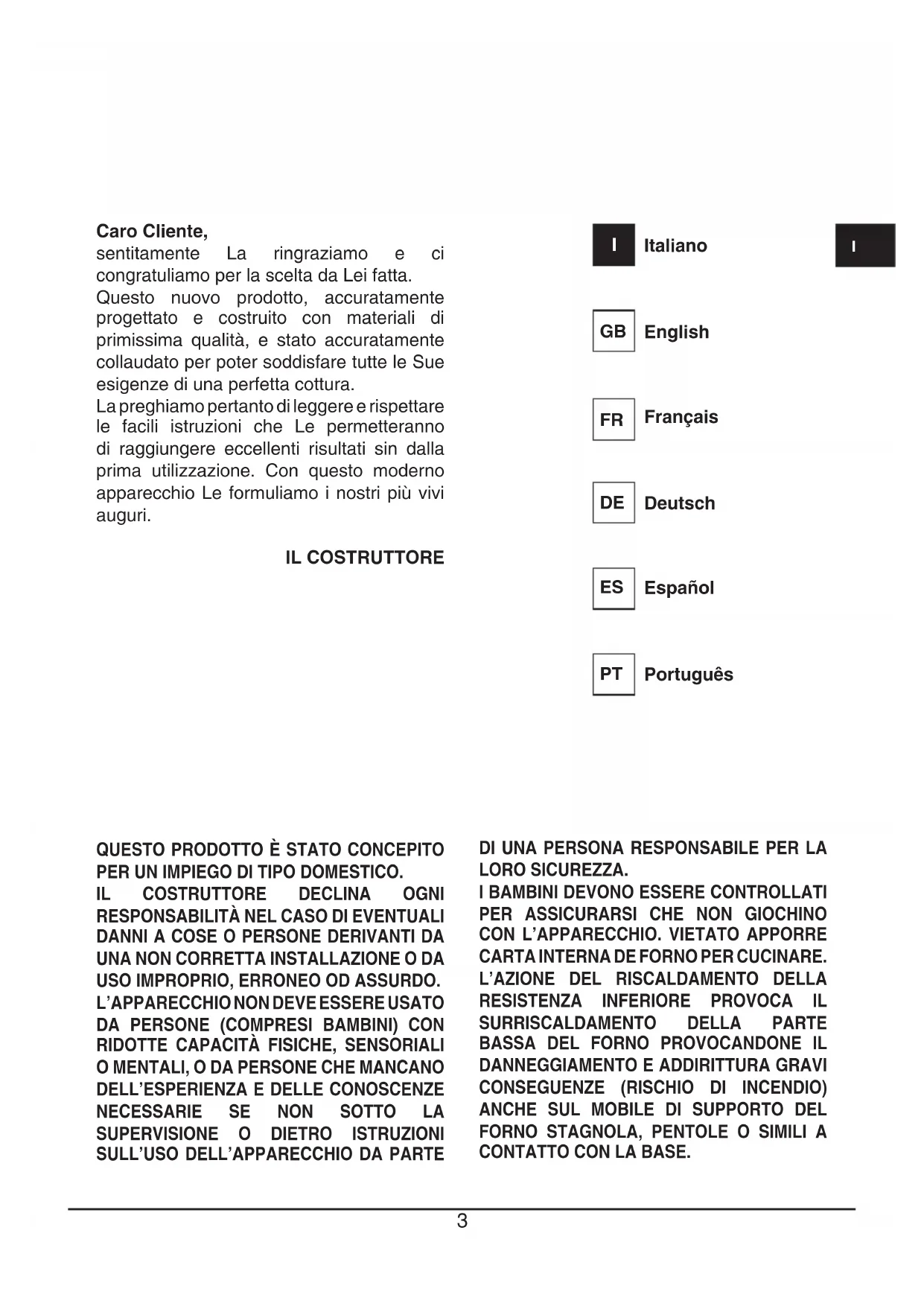Caro Cliente, sentitamente La ringraziamo e ci congratuliamo per la scelta da Lei fatta. Questo nuovo prodotto, accuratamente progettato e costruito con materiali di primissima qualità, e stato accuratamente collaudato per poter soddisfare tutte le Sue esigenze di una perfetta cottura. La preghiamo pertanto di leggere e rispettare le facili istruzioni che Le permetteranno di raggiungere eccellenti risultati sin dalla prima utilizzazione. Con questo moderno apparecchio Le formuliamo i nostri più vivi auguri. IL COSTRUTTORE