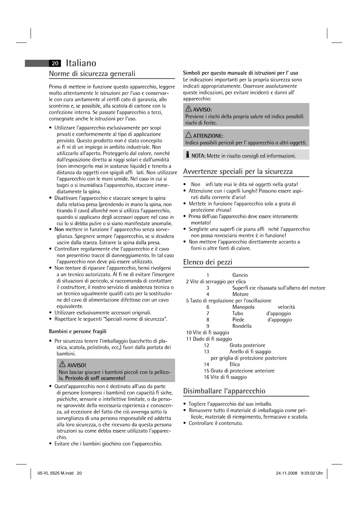 Dati tecnici Modello: ...........................................................................VL 5525 M Alimentazione rete: ........................................220-240 V, 50 Hz Consumo di energia:...............................................................30 W Classe di protezione: ........................................................................Ι Peso netto: .............................................................................2,90 kg Questo apparecchio è stato controllato sulla base di tutte le direttive CE attuali in vigore in questo settore, quali per esempio la normativa in materia di compati- bilità elettromagnetica e la direttiva in materia di bassa tensione, ed è stato costruito conformemente alle norme di sicurezza più moderne. Con riserva di apportare modi che tecniche. Signi cato del simbolo „Eliminazione“ Salvaguardare l’ ambiente, gli elettrodomestici non vanno eliminati come ri uti domestici. Per l’ eliminazione degli elettrodomestici, fare uso dei posti di raccolta previsti per questo tipo e porre quegli elettrodomestici che non sono più in uso. Si contribuisce così ad evitare un e etto potenziale sull’ ambiente e sulla salute, dovuto magari ad una elimina- zione sbagliata. Questo signi ca un contributo personale alla riutiliz- zazione, al riciclaggio e altre forme di utilizzazione di elettrodomestici ed apparecchi elettronici usati. Si possono trovare le corrispondenti informazioni sugli appositi luoghi di raccolta, nelle amministrazioni dei comuni. 05-VL 5525 M.indd 2205-VL 5525 M.indd 22 24.11.2008 9:33:03 Uhr24.11.2008 9:33:03 UhrEnglish