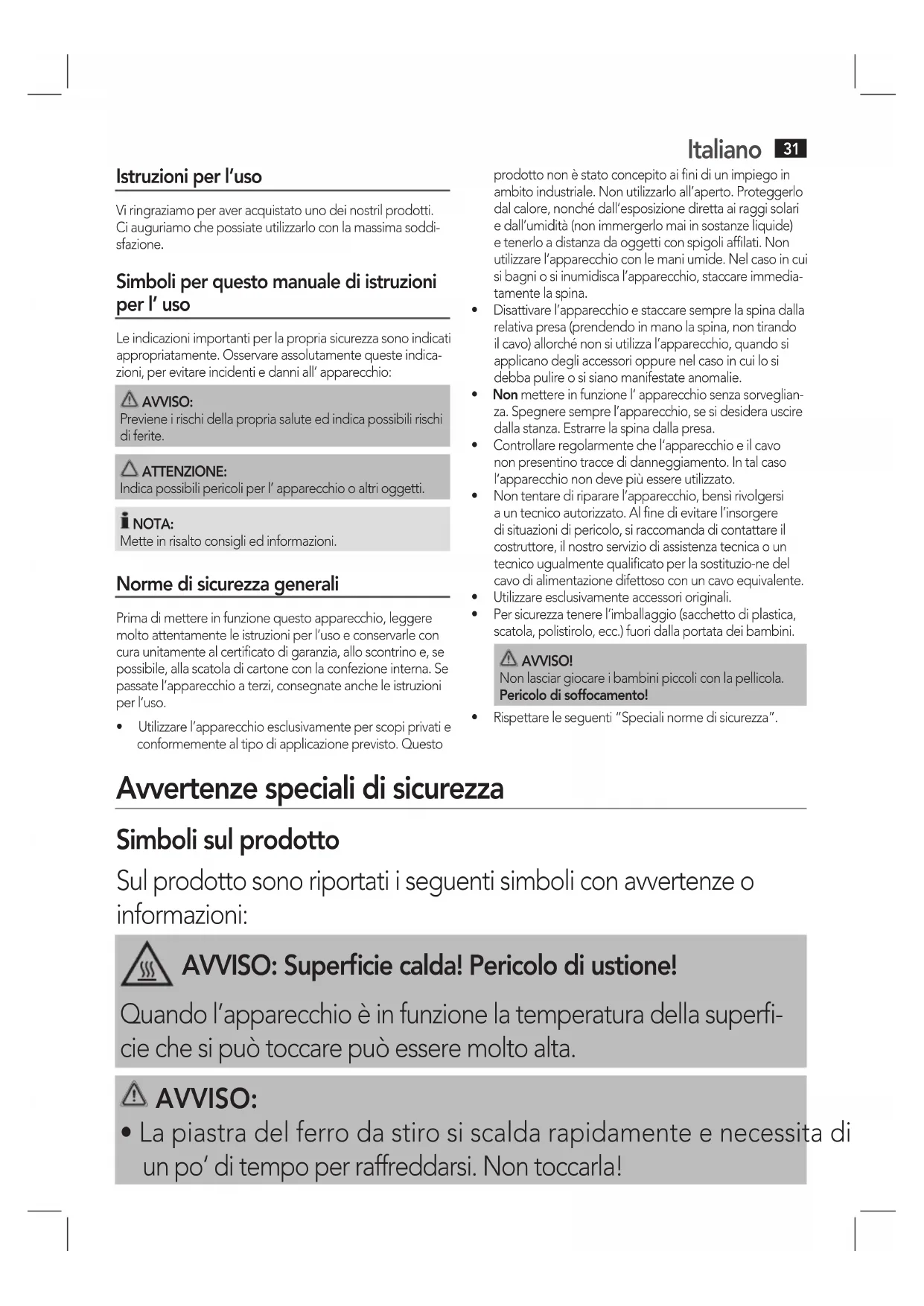 - Non mettere in funzione l’ apparecchio senza sorveglian- za. Spegnere sempre l’apparecchio, se si desidera uscire dalla stanza. Estrarre la spina dalla presa.• Controllareregolarmentechel‘apparecchioeilcavonon presentino tracce di danneggiamento. In tal caso l‘apparecchio non deve più essere utilizzato.• Nontentarediripararel’apparecchio,bensìrivolgersia un tecnico autorizzato. Al fine di evitare l’insorgere di situazioni di pericolo, si raccomanda di contattare il costruttore, il nostro servizio di assistenza tecnica o un tecnico ugualmente qualificato per la sostituzio-ne del cavo di alimentazione difettoso con un cavo equivalente.• Utilizzareesclusivamenteaccessorioriginali.• Persicurezzatenerel’imballaggio(sacchettodiplastica,scatola, polistirolo, ecc.) fuori dalla portata dei bambini. AVVISO! Non lasciar giocare i bambini piccoli con la pellicola. Pericolo di soffocamento!• Rispettareleseguenti“Specialinormedisicurezza”. Avvertenze speciali di sicurezza Simboli sul prodotto Sul prodotto sono riportati i seguenti simboli con avvertenze o informazioni: AVVISO: Superficie calda! Pericolo di ustione! Quando l’apparecchio è in funzione la temperatura della superfi- cie che si può toccare può essere molto alta. AVVISO: