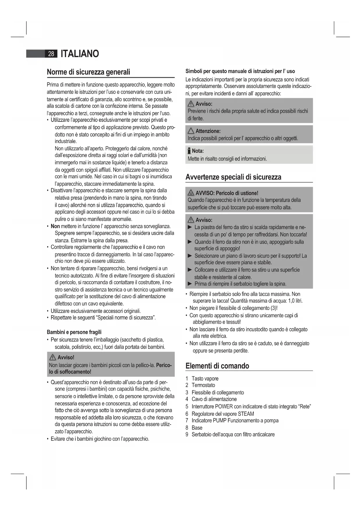 - Evitare che i bambini giochino con l’apparecchio. Simboli per questo manuale di istruzioni per l’ uso Le indicazioni importanti per la propria sicurezza sono indicati appropriatamente. Osservare assolutamente queste indicazio- ni, per evitare incidenti e danni all’ apparecchio: A vviso: Previene i rischi della propria salute ed indica possibili rischi di ferite. Attenzione: Indica possibili pericoli per l’ apparecchio o altri oggetti. Nota: Mette in risalto consigli ed informazioni. Avvertenze speciali di sicurezza AVVISO: Pericolo di ustione! Quando l’apparecchio è in funzione la temperatura della supercie che si può toccare può essere molto alta. A vviso: ► La piastra del ferro da stiro si scalda rapidamente e ne- cessita di un po‘ di tempo per raffreddarsi. Non toccarla! ► Quando il ferro da stiro non è in uso, appoggiarlo sulla supercie di appoggio! ► Selezionare un piano di lavoro sicuro per il supporto! La supercie deve essere piana e stabile. ► Collocare e utilizzare il ferro sa stiro u una supercie stabile e resistente al calore. ► Prima di riempire il serbatoio togliere la spina.