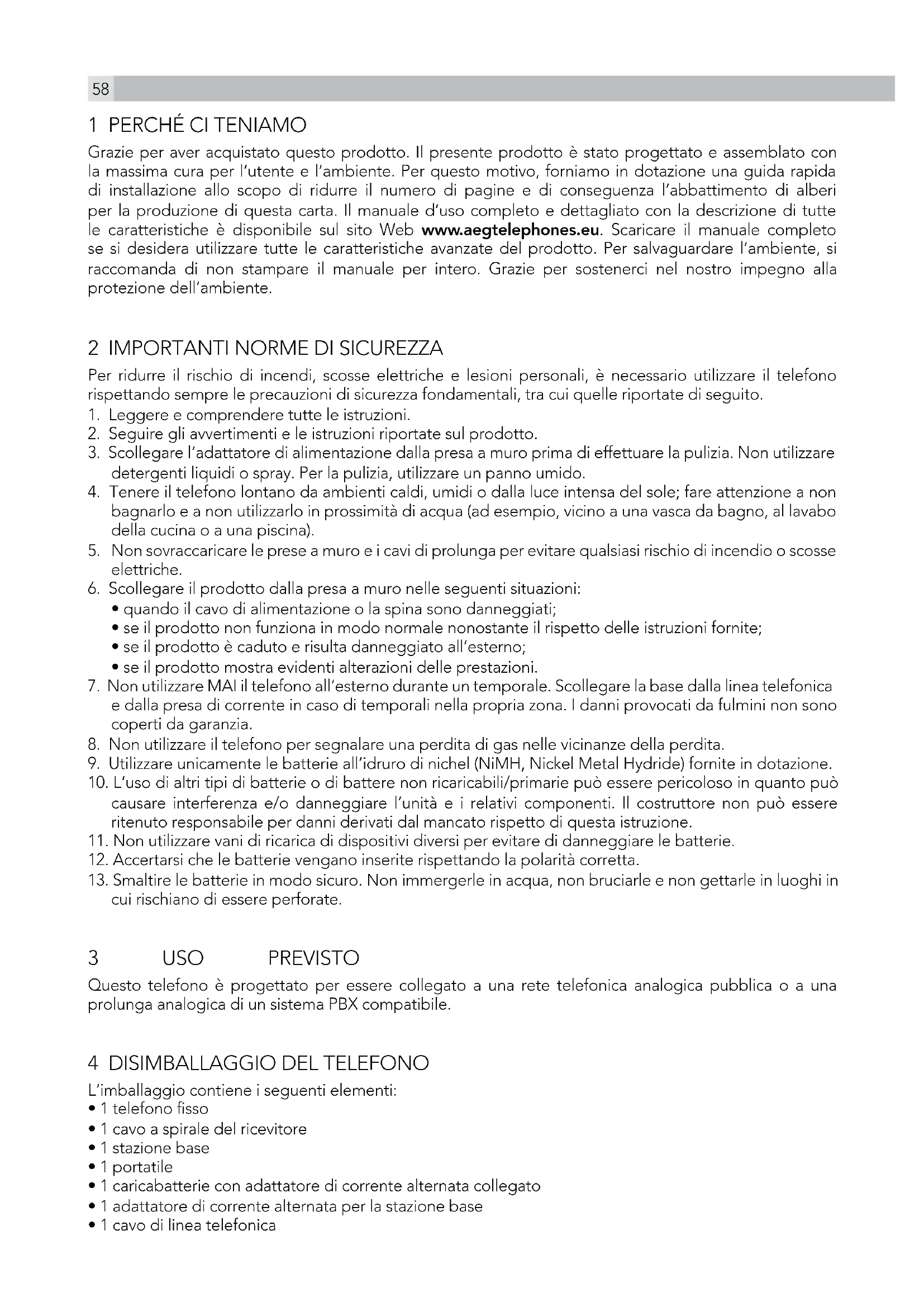 Grazie per aver acquistato questo prodotto. Il presente prodotto è stato progettato e assemblato con la massima cura per l‘utente e l‘ambiente. Per questo motivo, forniamo in dotazione una guida rapida di installazione allo scopo di ridurre il numero di pagine e di conseguenza l‘abbattimento di alberi per la produzione di questa carta. Il manuale d‘uso completo e dettagliato con la descrizione di tutte le caratteristiche è disponibile sul sito Web www.aegtelephones.eu. Scaricare il manuale completo se si desidera utilizzare tutte le caratteristiche avanzate del prodotto. Per salvaguardare l‘ambiente, si raccomanda di non stampare il manuale per intero. Grazie per sostenerci nel nostro impegno alla protezione dell‘ambiente.