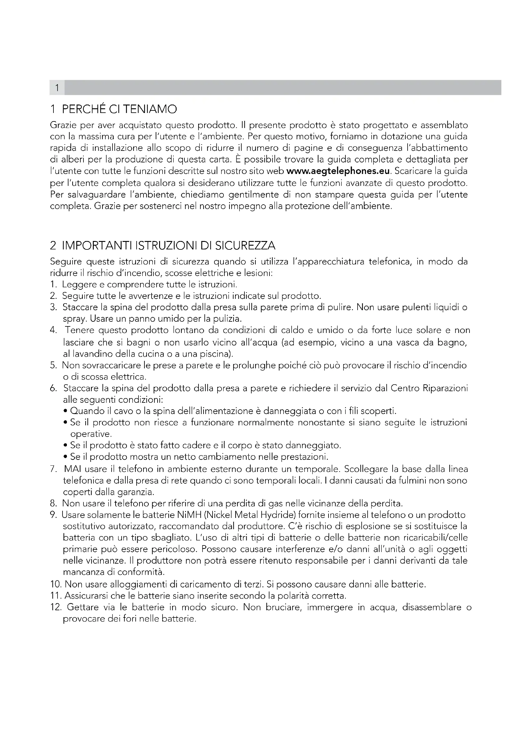 Grazie per aver acquistato questo prodotto. Il presente prodotto è stato progettato e assemblato con la massima cura per l‘utente e l‘ambiente. Per questo motivo, forniamo in dotazione una guida rapida di installazione allo scopo di ridurre il numero di pagine e di conseguenza l‘abbattimento di alberi per la produzione di questa carta. È possibile trovare la guida completa e dettagliata per l’utente con tutte le funzioni descritte sul nostro sito web www.aegtelephones.eu. Scaricare la guida per l’utente completa qualora si desiderano utilizzare tutte le funzioni avanzate di questo prodotto. Per salvaguardare l’ambiente, chiediamo gentilmente di non stampare questa guida per l’utente completa. Grazie per sostenerci nel nostro impegno alla protezione dell‘ambiente.