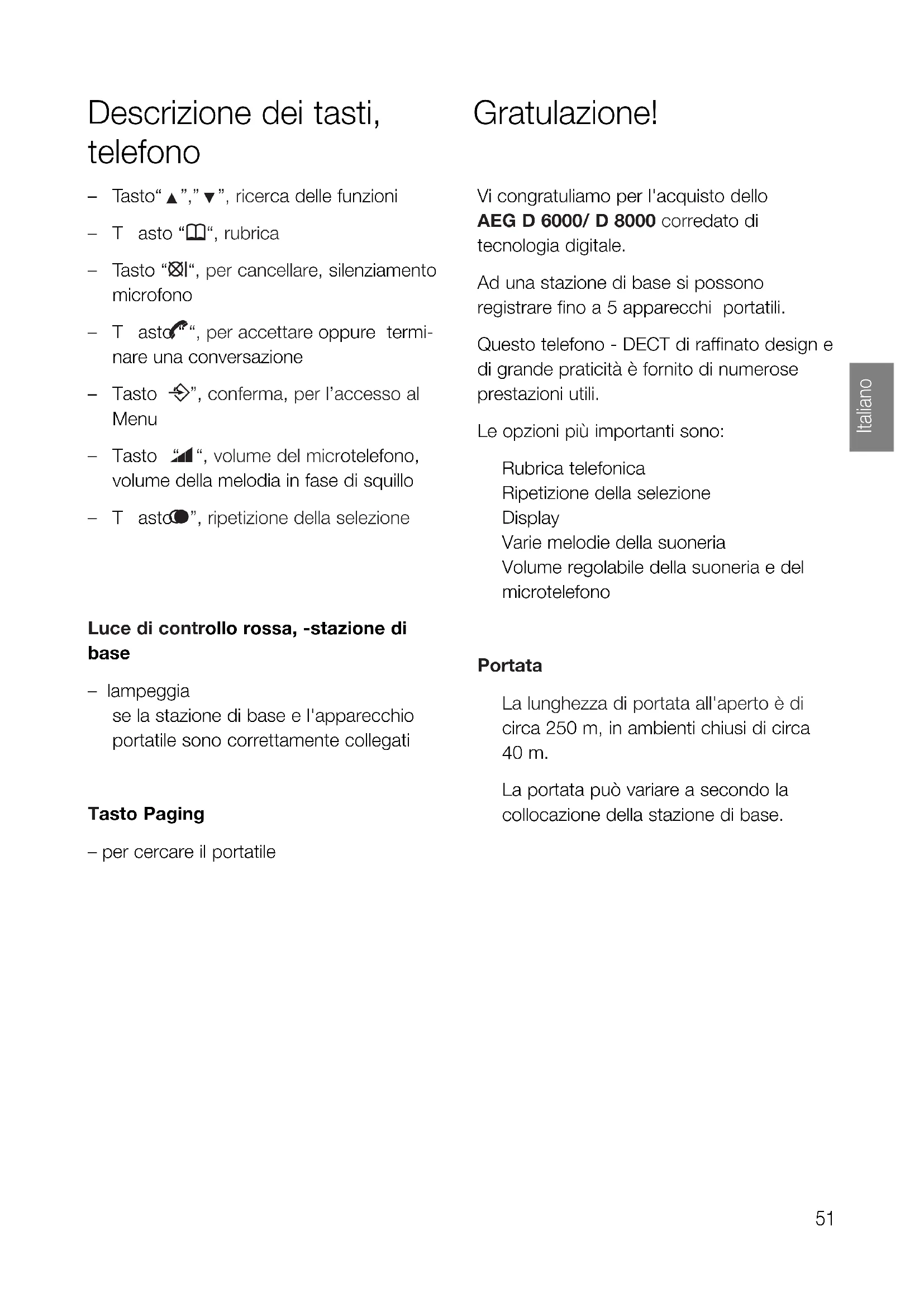 “, per accettare oppure termi- nare una conversazione – Tasto “ n”, conferma, per l’accesso al Menu – Tasto “ u“, volume del microtelefono, volume della melodia in fase di squillo –Tasto “ G”, ripetizione della selezione Luce di controllo rossa, -stazione di base – lampeggia se la stazione di base e l'apparecchio portatile sono correttamente collegati Tasto Paging – per cercare il portatile Vi congratuliamo per l'acquisto dello AEG D 6000/ D 8000 corredato di tecnologia digitale. Ad una stazione di base si possono registrare fino a 5 apparecchi portatili. Questo telefono - DECT di raffinato design e di grande praticità è fornito di numerose prestazioni utili. Le opzioni più importanti sono: Rubrica telefonica Ripetizione della selezione Display Varie melodie della suoneria Volume regolabile della suoneria e del microtelefono Portata La lunghezza di portata all'aperto è di circa 250 m, in ambienti chiusi di circa 40 m. La portata può variare a secondo la collocazione della stazione di base. Gratulazione!Luce di controllo rossa, -stazione di base – illumina se la stazione di base e l'apparecchio portatile sono correttamente collegati se il portatile è in carica sulla base Luce di controllo verde, -stazione di base – LED, memoria piena Luce di controllo rossa, -stazione di base – LED, segretaria, nuovi messaggi se il portatile è correttamente collegato – –/+ Vol, regolazione del volume –“x “, OGM, Il messaggio appena ascoltato viene ripetuto, tutti i messaggi vengono ripetuti, registrazione del testo d’annuncio