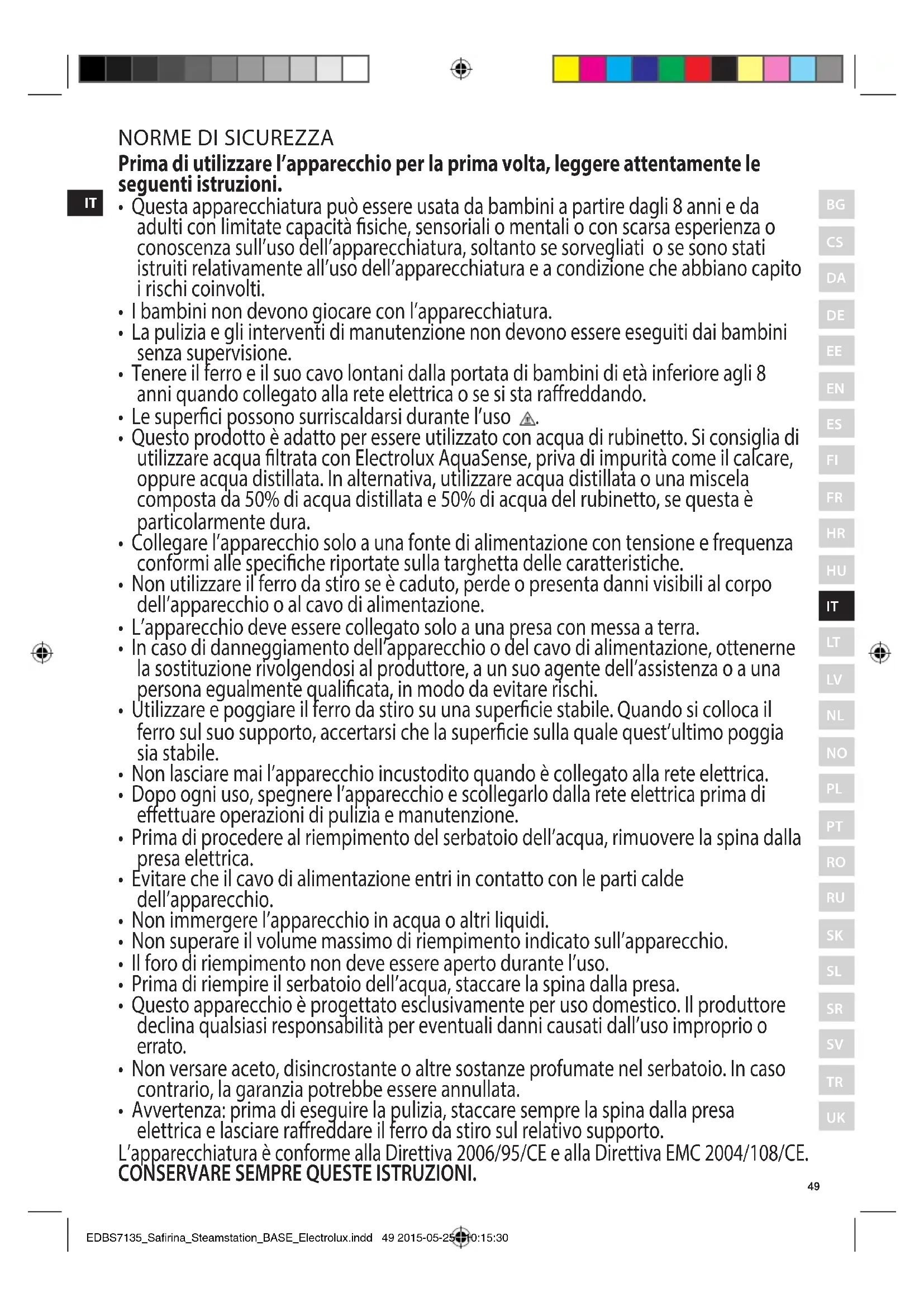 EDBS7135_Safirina_Steamstation_BASE_Electrolux.indd 49 2015-05-25 10:15:30IT COMPONENTI A. Pulsante del vapore B. Impugnatura morbida C. Segno di allineamento della temperatura D. Selettore della temperatura E. Spia di indicazione della temperatura F. Tubo del vapore G. Cavo di alimentazione H. Vano per riporre il cavo di alimentazione