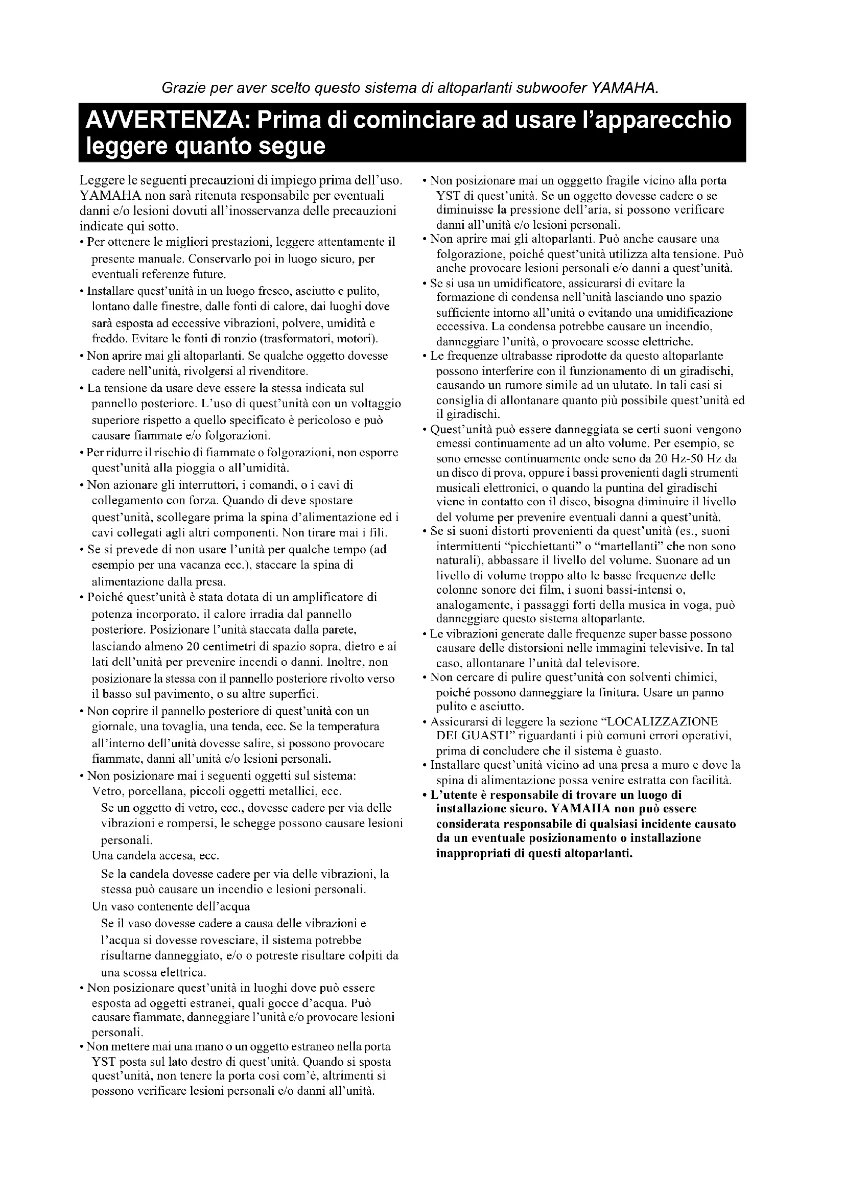 - L’utente è responsabile di trovare un luogo di installazione sicuro. YAMAHA non può essere considerata responsabile di qualsiasi incidente causato da un eventuale posizionamento o installazione inappropriati di questi altoparlanti. AVVERTENZA: Prima di cominciare ad usare l’apparecchio leggere quanto segue1 Italiano