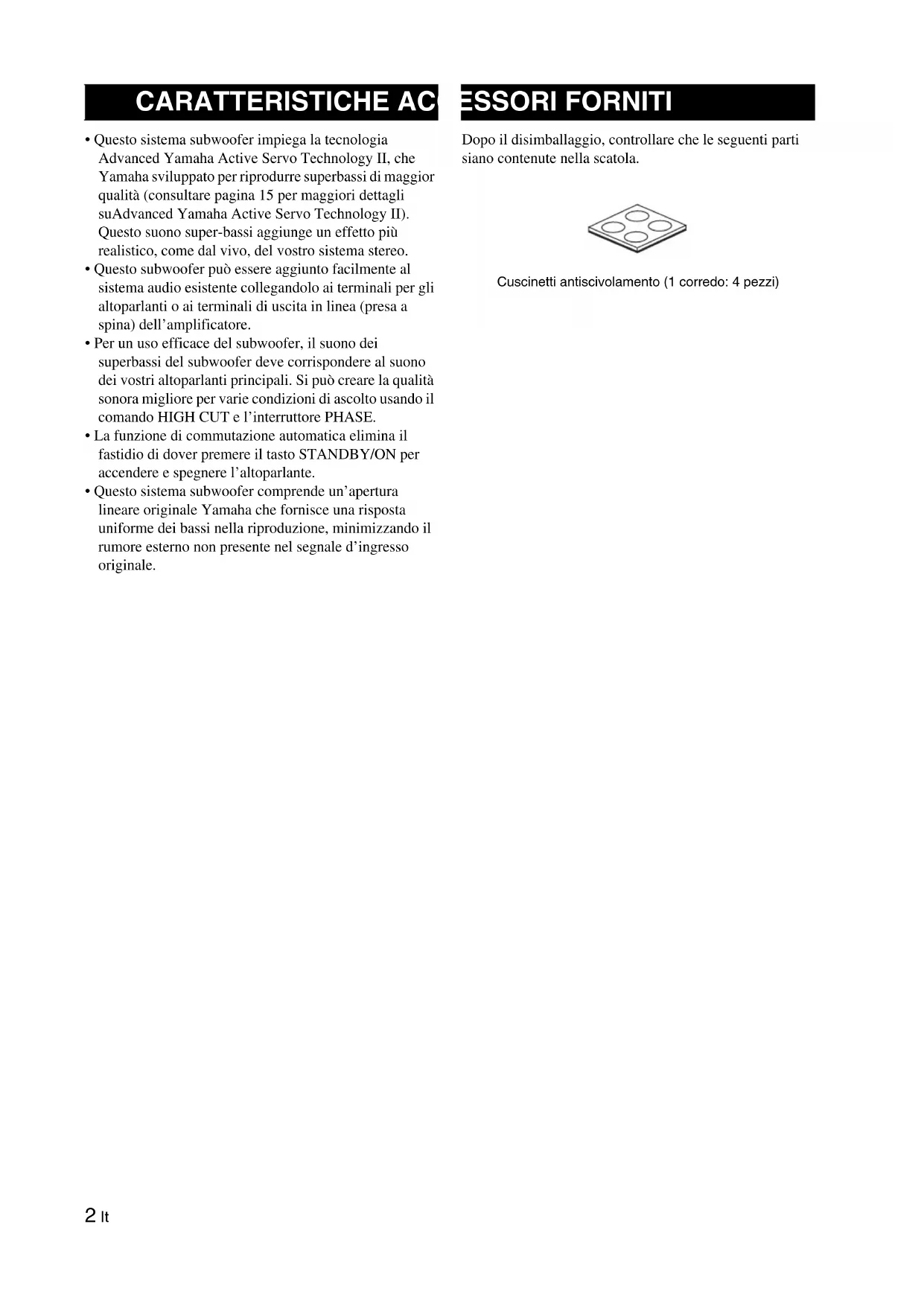 - Questo sistema subwoofer impiega la tecnologia Advanced Yamaha Active Servo Technology II, che Yamaha sviluppato per riprodurre superbassi di maggior qualità (consultare pagina 15 per maggiori dettagli suAdvanced Yamaha Active Servo Technology II). Questo suono super-bassi aggiunge un effetto più realistico, come dal vivo, del vostro sistema stereo.