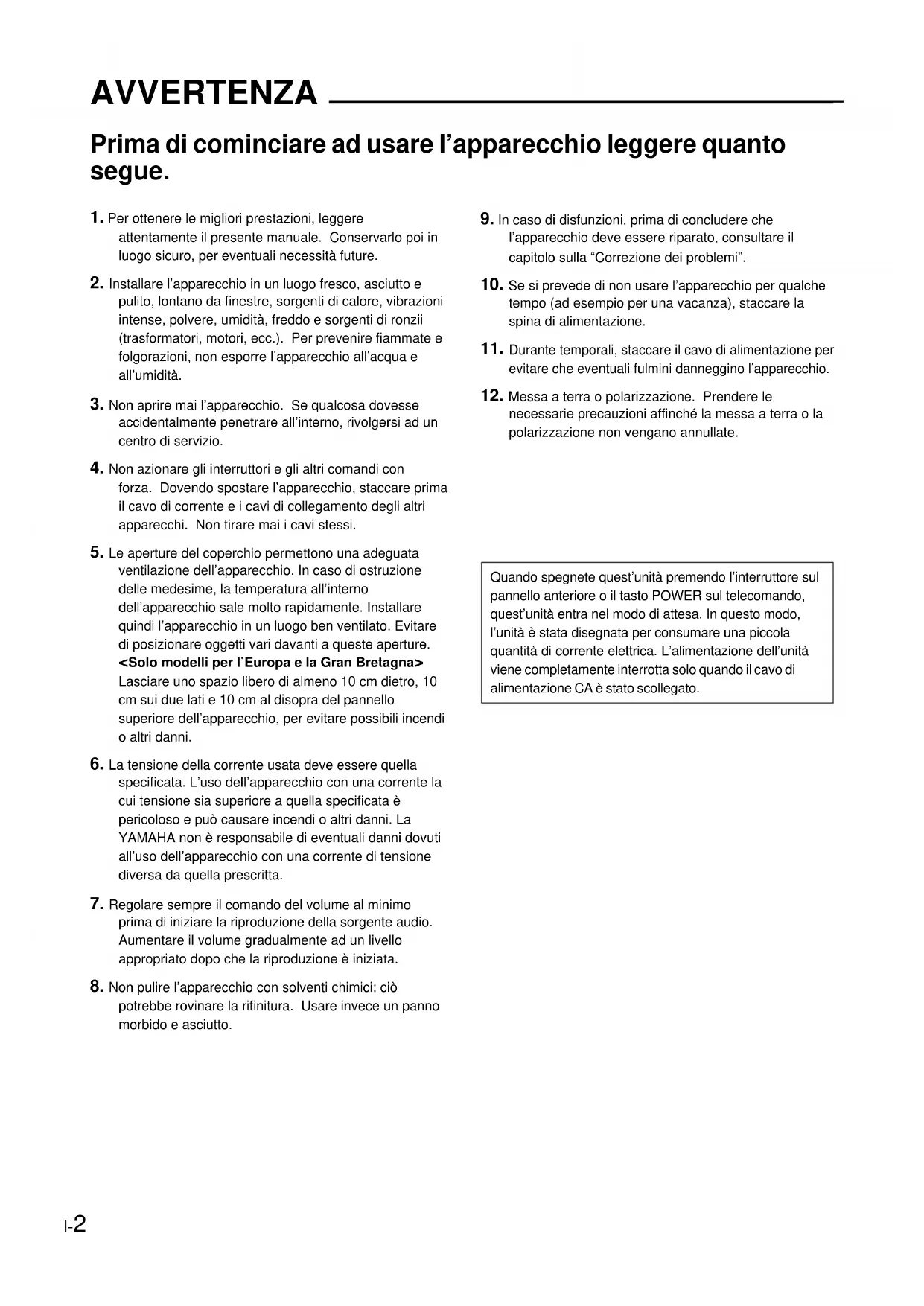 specificata. L’uso dell’apparecchio con una corrente la cui tensione sia superiore a quella specificata è pericoloso e può causare incendi o altri danni. La YAMAHA non è responsabile di eventuali danni dovuti all’uso dell’apparecchio con una corrente di tensione diversa da quella prescritta.
