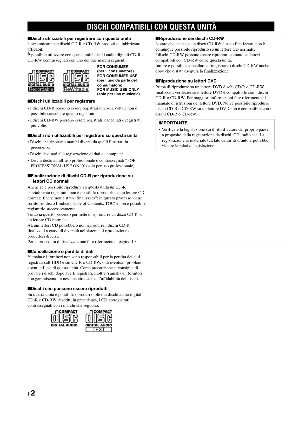 - Dati tecnici ITALIANO Introduzione Grazie per aver acquistato questo prodotto YAMAHA. Ci auguriamo che vi dia molti anni di divertimento senza interruzioni. Per ottenere le prestazioni migliori leggere con attenzione questo manuale. Servirà da guida nell’uso del prodotto YAMAHA. Questa unità è dotata di un disco rigido di grande capacità (HDD) che permette una registrazione di lunga durata. È possibile copiare sull’HDD diversi CD, scegliere e riprodurre i brani preferiti dai dati copiati sull’HDD. È anche possibile realizzare montaggi delle varie sorgenti audio registrate sull’HDD. Copiando su dischi CD-R o CD-RW la sorgente audio risultante dal montaggio, è possibile usare questa unità per creare facilmente il proprio CD preferito.I-2 ■ Dischi utilizzabili per registrare con questa unità Usare unicamente dischi CD-R e CD-RW prodotti da fabbricanti affidabili. È possibile utilizzare con questa unità dischi audio digitali CD-R e CD-RW contrassegnati con uno dei due marchi seguenti. ■ Dischi utilizzabili per registrare p. 65