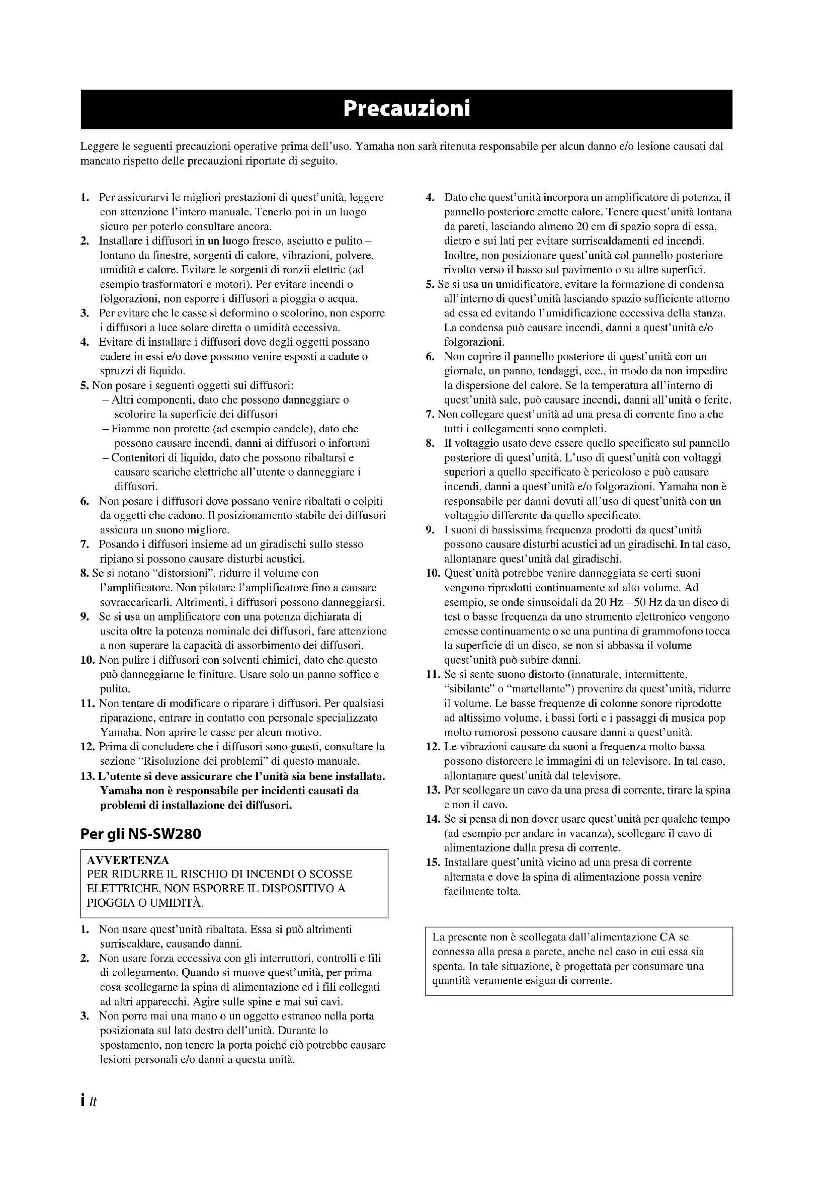 Yamaha non è responsabile per incidenti causati da problemi di installazione dei diffusori. Per gli NS-SW280