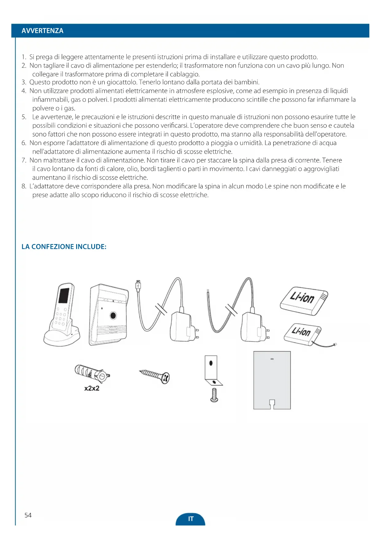 PRECAUZIONE Non coprire le aperture di ventilazione con oggetti come giornali, tovaglie, tende, ecc. Non permettere che questo prodotto venga direttamente a contatto con fonti di calore o fiamme libere. Il normale funzionamento del prodotto può essere disturbato da forti interferenze elettromagnetiche. Questa apparecchiatura è costruita esclusivamente per un uso domestico. Il dispositivo non deve essere esposto a schizzi e non deve essere sommerso. Nessun oggetto contenente liquidi, come un vaso, deve essere posto sul dispositivo. Mantenere una distanza minima di sicurezza di 10 cm attorno al prodotto per assicurare un’adeguata ventilazione. Assicurarsi il pulsante del campanello non venga installato dove può essere sommerso dall’acqua o esposto alla pioggia. Non permettere ai bambini di giocare con il dispositivo