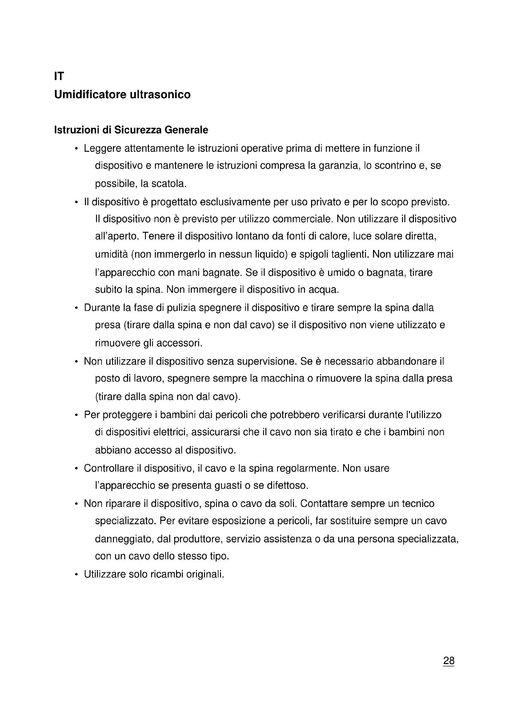 Umidificatore ultrasonico Istruzioni di Sicurezza Generale
