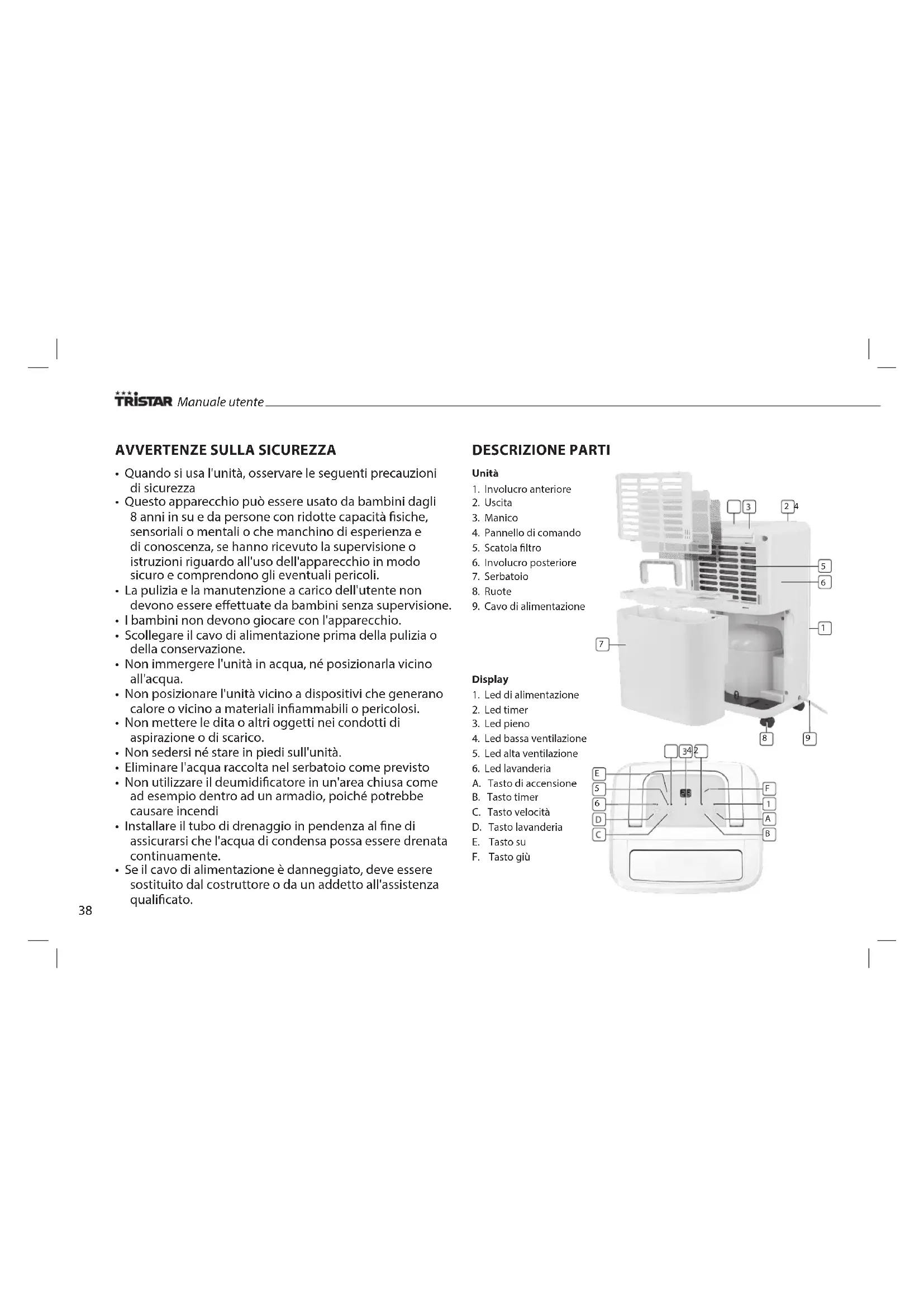 A. Tasto di accensione B. Tasto timer C. Tasto velocità D. Tasto lavanderia E. Tasto su F. Tasto giù Manuale utente