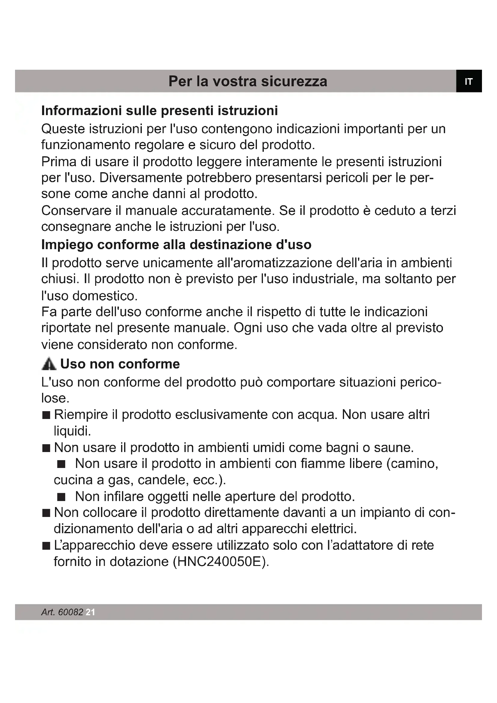 rectement par l’appareil, y compris lorsque le dommage survenu sur l’appareil est couvert par la garantie.FR Art. 60082 21 Per la vostra sicurezza Informazioni sulle presenti istruzioni Queste istruzioni per l'uso contengono indicazioni importanti per un funzionamento regolare e sicuro del prodotto. Prima di usare il prodotto leggere interamente le presenti istruzioni per l'uso. Diversamente potrebbero presentarsi pericoli per le per- sone come anche danni al prodotto. Conservare il manuale accuratamente. Se il prodotto è ceduto a terzi consegnare anche le istruzioni per l'uso. Impiego conforme alla destinazione d'uso Il prodotto serve unicamente all'aromatizzazione dell'aria in ambienti chiusi. Il prodotto non è previsto per l'uso industriale, ma soltanto per l'uso domestico. Fa parte dell'uso conforme anche il rispetto di tutte le indicazioni riportate nel presente manuale. Ogni uso che vada oltre al previsto viene considerato non conforme. Uso non conforme L'uso non conforme del prodotto può comportare situazioni perico- lose. ■ Riempire il prodotto esclusivamente con acqua. Non usare altri liquidi. ■ Non usare il prodotto in ambienti umidi come bagni o saune. ■ Non usare il prodotto in ambienti con amme libere (camino, cucina a gas, candele, ecc.). ■ Non inlare oggetti nelle aperture del prodotto. ■ Non collocare il prodotto direttamente davanti a un impianto di con- dizionamento dell'aria o ad altri apparecchi elettrici. ■ L’apparecchio deve essere utilizzato solo con l’adattatore di rete fornito in dotazione (HNC240050E). ITIT
