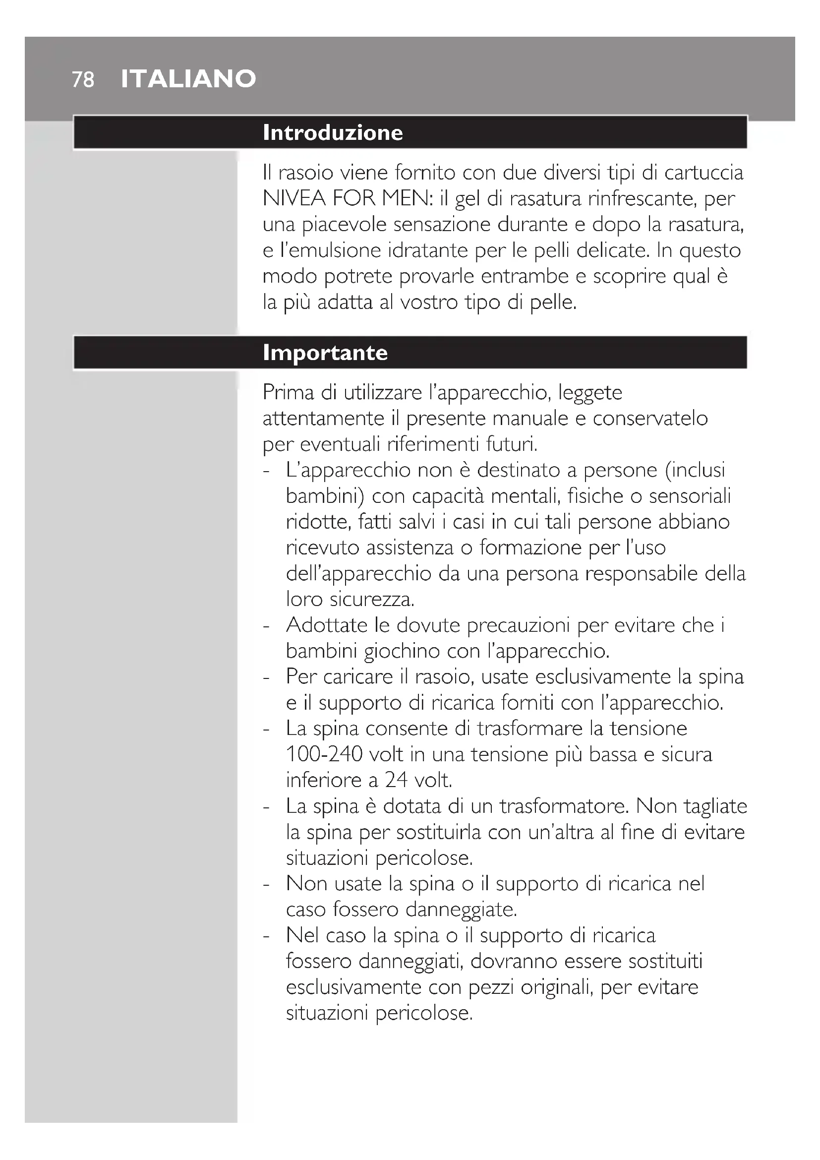 Français 7778 Introduzione Il rasoio viene fornito con due diversi tipi di cartuccia NIVEA FOR MEN: il gel di rasatura rinfrescante, per una piacevole sensazione durante e dopo la rasatura, e l’emulsione idratante per le pelli delicate. In questo modo potrete provarle entrambe e scoprire qual è la più adatta al vostro tipo di pelle. Importante Prima di utilizzare l’apparecchio, leggete attentamente il presente manuale e conservatelo per eventuali riferimenti futuri. L’apparecchio non è destinato a persone (inclusi bambini) con capacità mentali, siche o sensoriali ridotte, fatti salvi i casi in cui tali persone abbiano ricevuto assistenza o formazione per l’uso dell’apparecchio da una persona responsabile della loro sicurezza. Adottate le dovute precauzioni per evitare che i bambini giochino con l’apparecchio. Per caricare il rasoio, usate esclusivamente la spina e il supporto di ricarica forniti con l’apparecchio. La spina consente di trasformare la tensione 100-240 volt in una tensione più bassa e sicura inferiore a 24 volt. La spina è dotata di un trasformatore. Non tagliate la spina per sostituirla con un’altra al ne di evitare situazioni pericolose. Non usate la spina o il supporto di ricarica nel caso fossero danneggiate. Nel caso la spina o il supporto di ricarica fossero danneggiati, dovranno essere sostituiti esclusivamente con pezzi originali, per evitare situazioni pericolose.