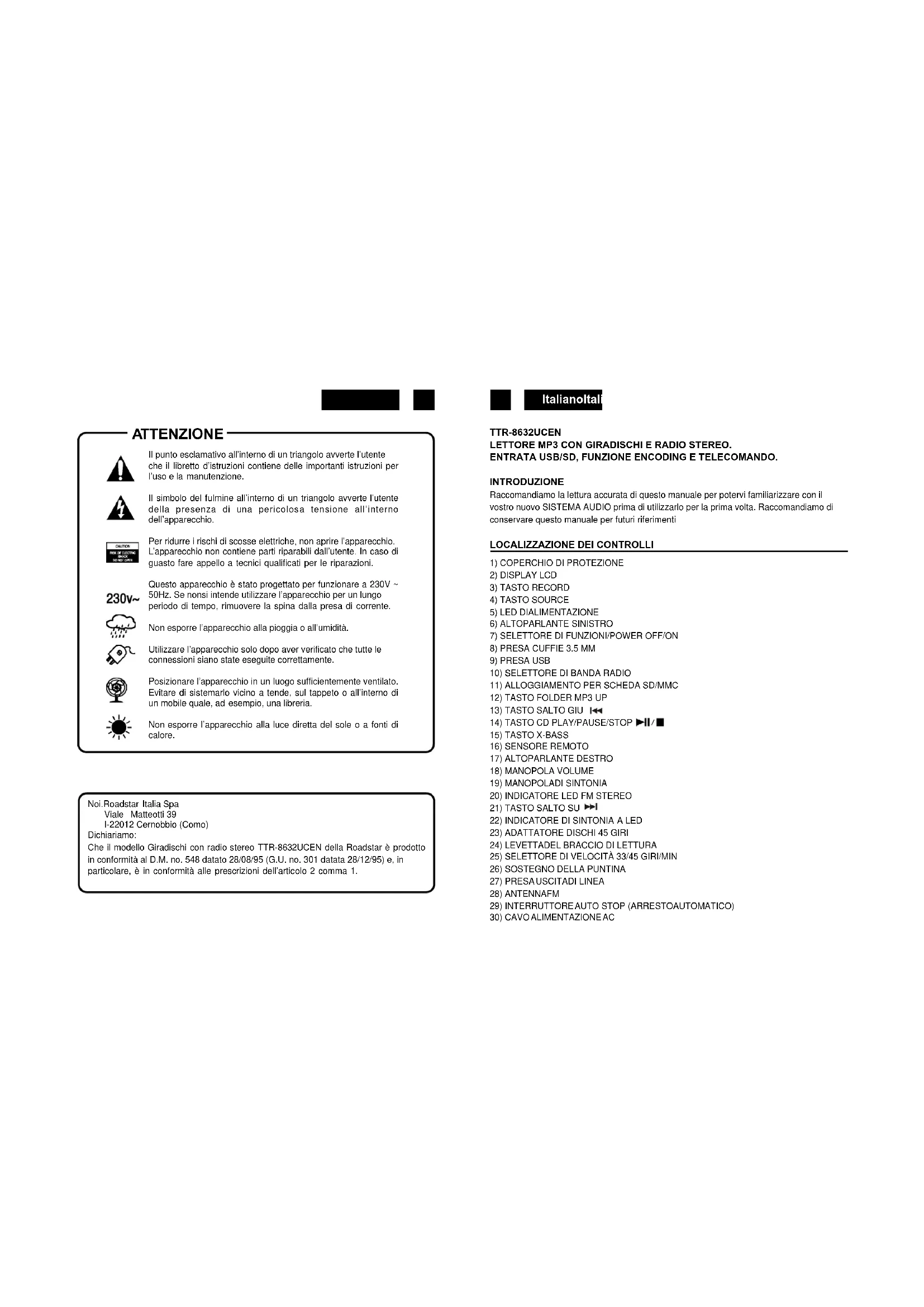 Il punto esclamativo all’interno di un triangolo avverte l’utente che il libretto d’istruzioni contiene delle importanti istruzioni per l’uso e la manutenzione. Il simbolo del fulmine all’interno di un triangolo avverte l’utente della presenza di una pericolosa tensione all’interno dell’apparecchio. Per ridurre i rischi di scosse elettriche, non aprire l’apparecchio. L’apparecchio non contiene parti riparabili dall’utente. In caso di guasto fare appello a tecnici qualificati per le riparazioni. Questo apparecchio è stato progettato per funzionare a 230V ~ 50Hz. Se nonsi intende utilizzare l’apparecchio per un lungo periodo di tempo, rimuovere la spina dalla presa di corrente. Non esporre l’apparecchio alla pioggia o all’umidità. Utilizzare l’apparecchio solo dopo aver verificato che tutte le connessioni siano state eseguite correttamente. Posizionare l’apparecchio in un luogo sufficientemente ventilato. Evitare di sistemarlo vicino a tende, sul tappeto o all’interno di un mobile quale, ad esempio, una libreria. Non esporre l’apparecchio alla luce diretta del sole o a fonti di calore. Noi.Roadstar Italia Spa Viale Matteotti 39 I-22012 Cernobbio (Como) Dichiariamo: Che il modello Giradischi con radio stereo TTR-8632UCEN della Roadstar è prodotto in conformità al D.M. no. 548 datato 28/08/95 (G.U. no. 301 datata 28/12/95) e, in particolare, è in conformità alle prescrizioni dell’articolo 2 comma 1. ATTENZIONEItalianoItaliano 33 34 TELECOMANDO INSTALLAZIONEDELLEBATTERIE Il telecomando necessita di 2 batterie del tipo AAA (non incluse).