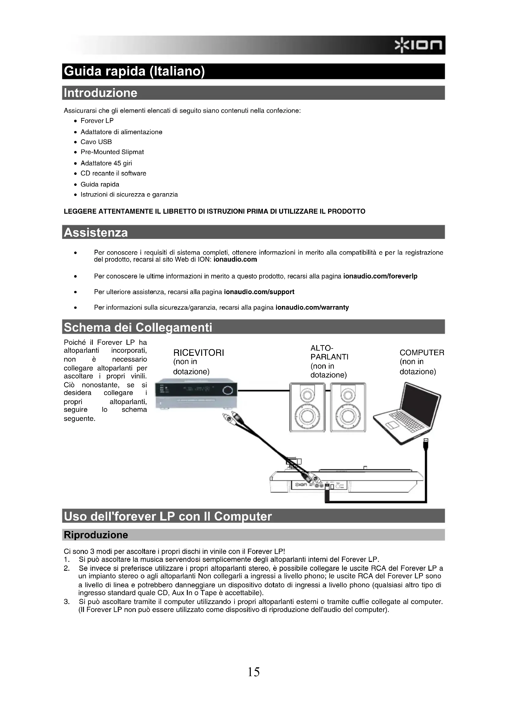 AVANT DE RETOURNER CE PRODUIT, veuillez communiquer avec le service technique de ION Audio pour de l’assistance.15 Guida rapida (Italiano) Introduzione Assicurarsi che gli elementi elencati di seguito siano contenuti nella confezione: • Forever LP • Adattatore di alimentazione • Cavo USB • Pre-Mounted Slipmat • Adattatore 45 giri • CD recante il software • Guida rapida • Istruzioni di sicurezza e garanzia LEGGERE ATTENTAMENTE IL LIBRETTO DI ISTRUZIONI PRIMA DI UTILIZZARE IL PRODOTTO Assistenza