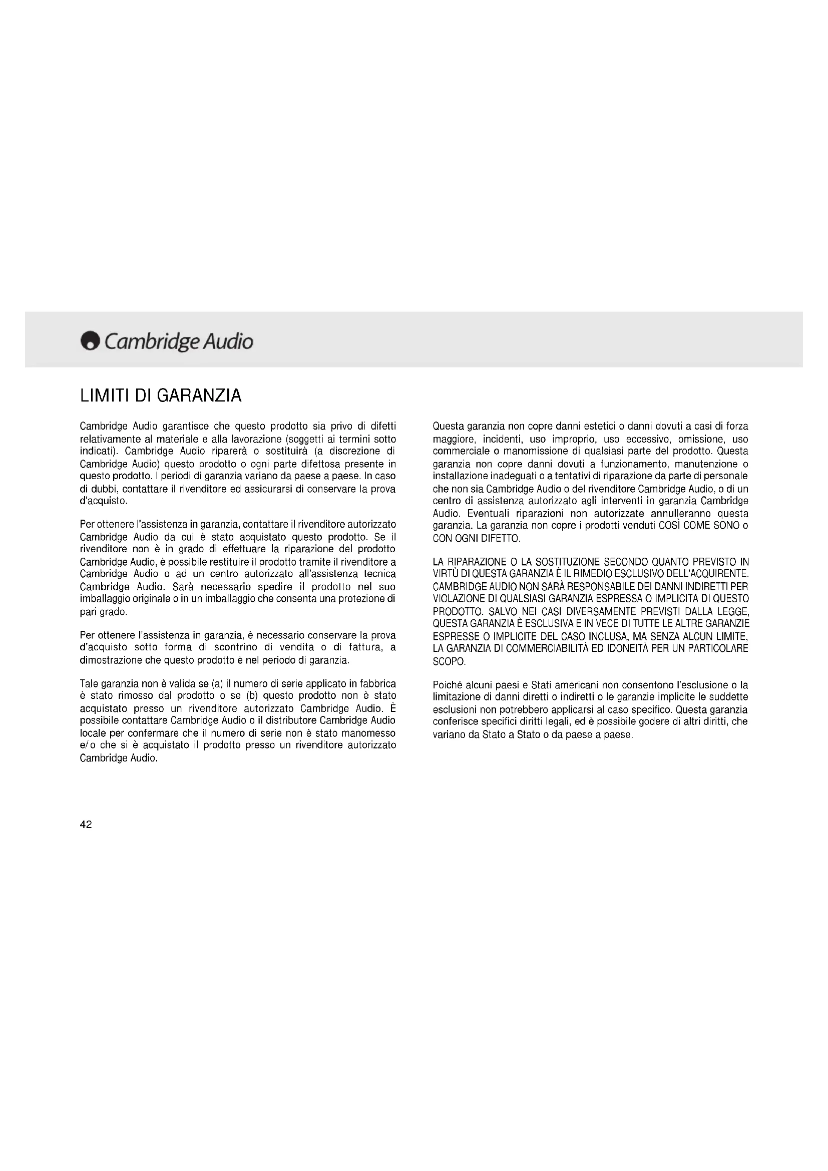 LA RIPARAZIONE O LA SOSTITUZIONE SECONDO QUANTO PREVISTO IN VIRTU DI QUESTA GARANZIA E IL RIMEDIO ESCLUSIVO DELL'ACQUIRENE. CAMBRIDGE AUDIO NON SARÀ RESPONSABILE DEI DANNI INDIRETTI PER VIOLAZIONE DI QUALSIASI GARANZIA ESPRESSA O IMPLICITA DI QUESTO PRODOTTO. SALVO NEI CASI DIVERSAMENTE PREVISTI DALLA LEGGE, QUESTA GARANZIA É ESCLUSIVA E IN VECE DI TUTTE LE ALTRE GARANZIE ESPRESSE O IMPLICITE DEL CASE INCLUSA, MA SENZA ALCUN LIMITE, LA GARANZIA DI COMMERCIABILITA ED IDONEITA PER UN PARTICOLARE SCOPO.