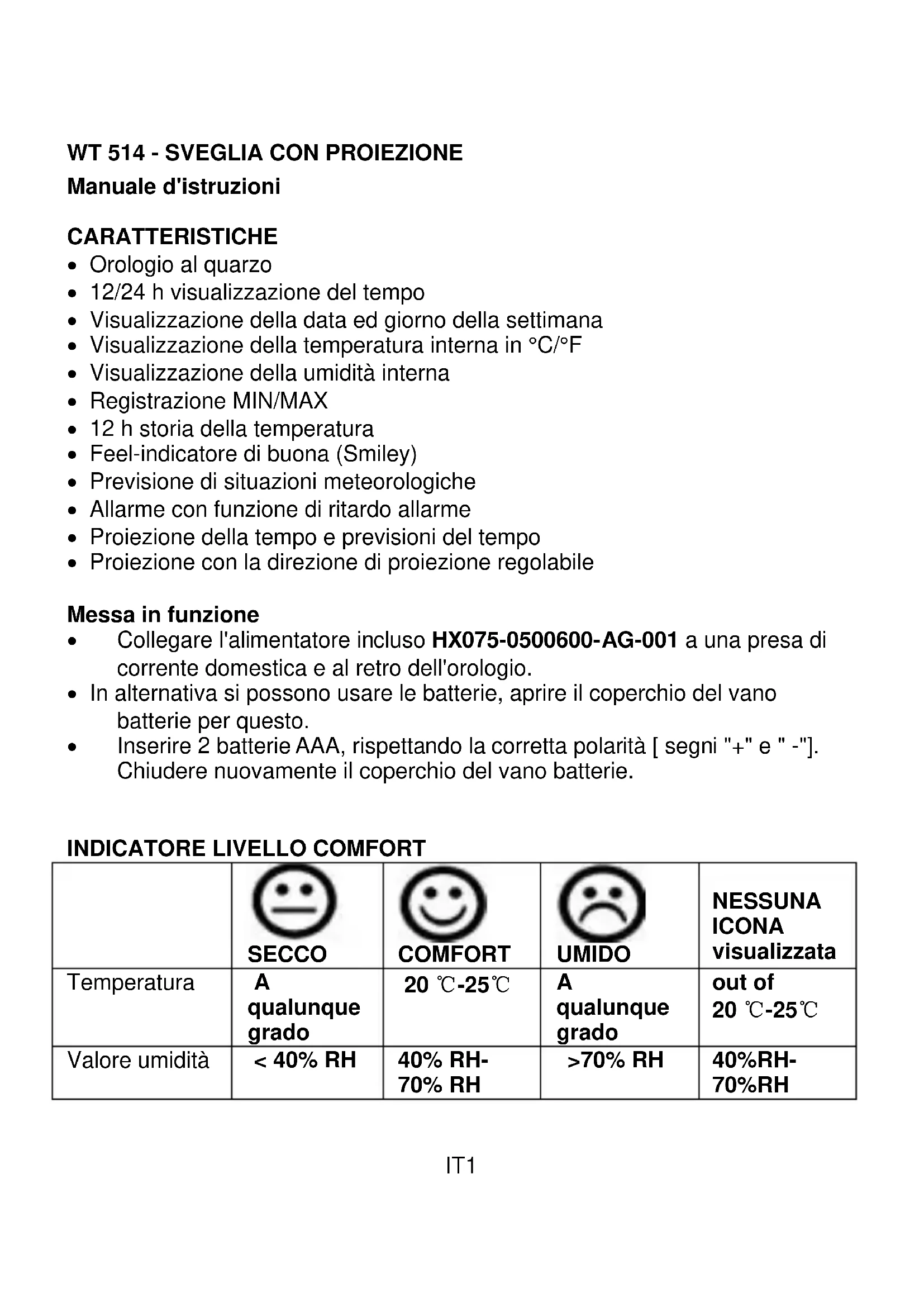 Manuale d'istruzioni CARATTERISTICHE Orologio al quarzo 12/24 h visualizzazione del tempo Visualizzazione della data ed giorno della settimana Visualizzazione della temperatura interna in °C/°F Visualizzazione della umidità interna Registrazione MIN/MAX 12 h storia della temperatura Feel-indicatore di buona (Smiley) Previsione di situazioni meteorologiche Allarme con funzione di ritardo allarme Proiezione della tempo e previsioni del tempo Proiezione con la direzione di proiezione regolabile Messa in funzione Collegare l'alimentatore incluso HX075-0500600-AG-001 a una presa di corrente domestica e al retro dell'orologio. In alternativa si possono usare le batterie, aprire il coperchio del vano batterie per questo. Inserire 2 batterie AAA, rispettando la corretta polarità [ segni "+" e " -"]. Chiudere nuovamente il coperchio del vano batterie.
