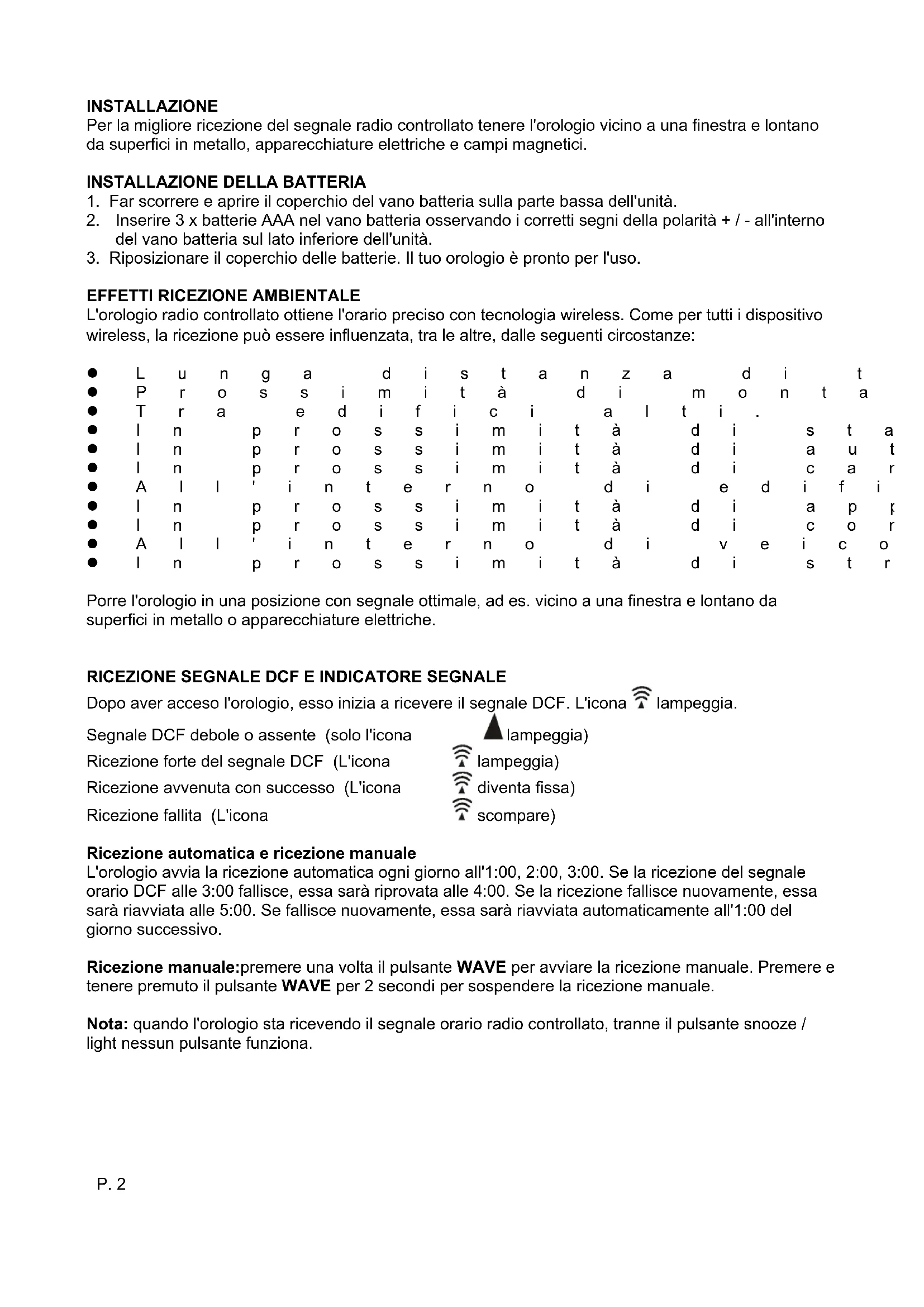 L'orologio radio controllato ottiene l'orario preco in technologia wireless. Come per tutti i dispositivo wireless, la ricezione peut essere influenzata, tra le altre, dalle seguenti circostanze: