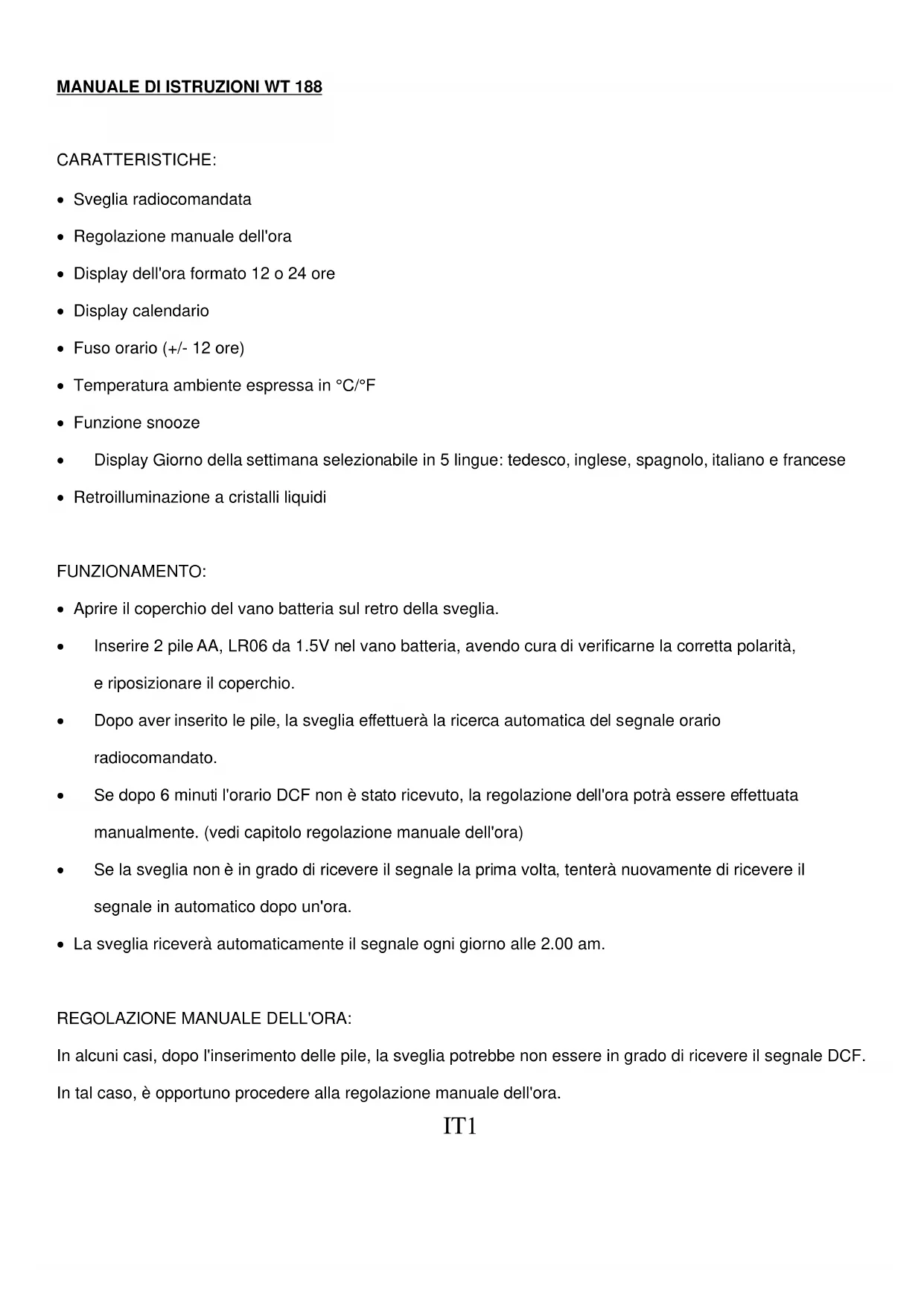In alcuni casi, dopo l'inserimento delle pile, la sveglia potrebbe non essere in grado di ricevere il segnale DCF. In tal caso, è opportuno procedere alla regolazione manuale dell'ora.
