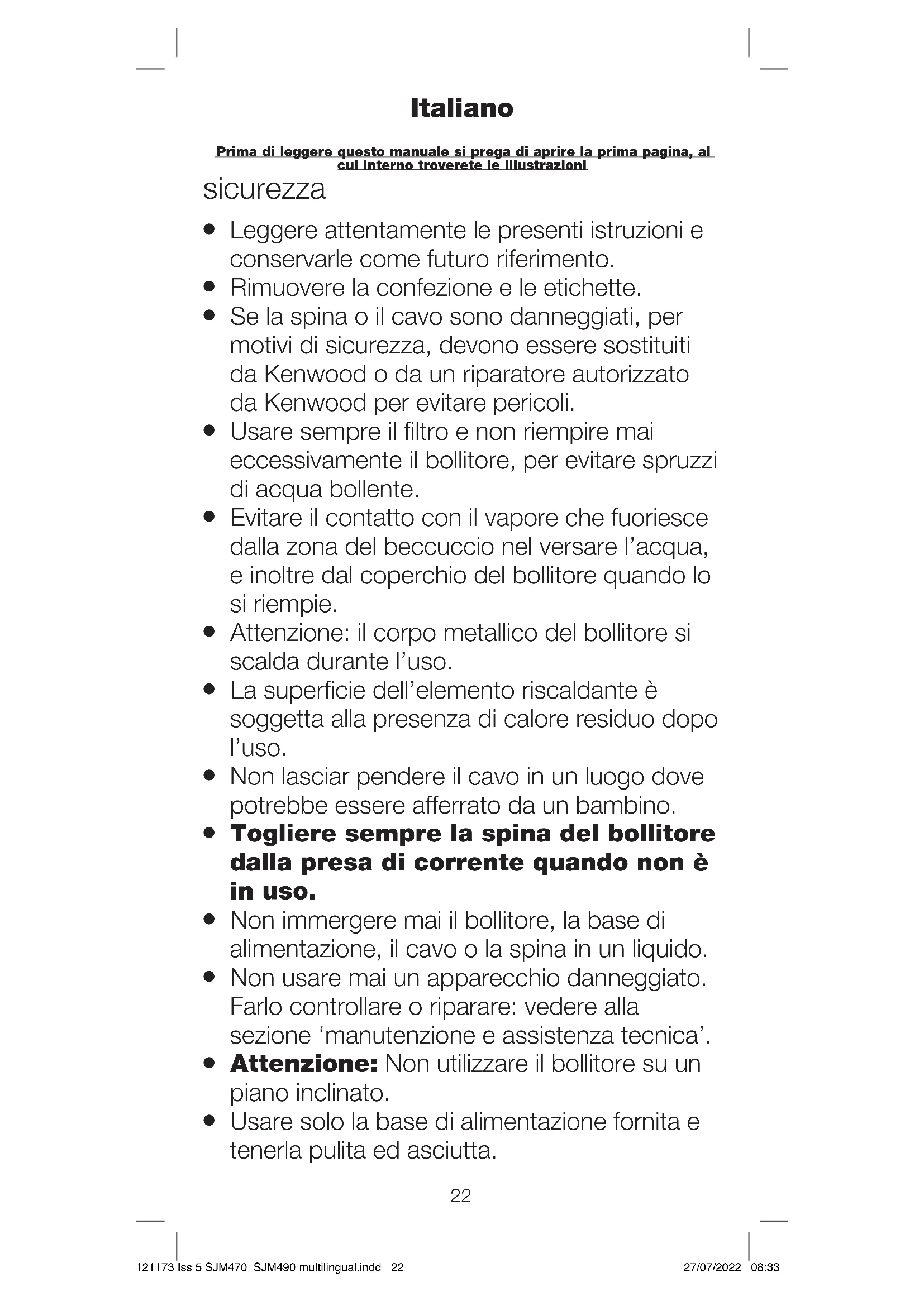 Utilizzare l'apparecchio solo per l'uso domestico per cui è stato realizzato. Kenwood non si assumerà alcuna responsabilità se l'apparecchio viene utilizzato in modo improprio o senza seguire le presenti istruzioni. 121173 Iss 5 SJM470_SJM490 multilingual.indd 24121173 Iss 5 SJM470_SJM490 multilingual.indd 24 27/07/2022 08:3327/07/2022 08:3325