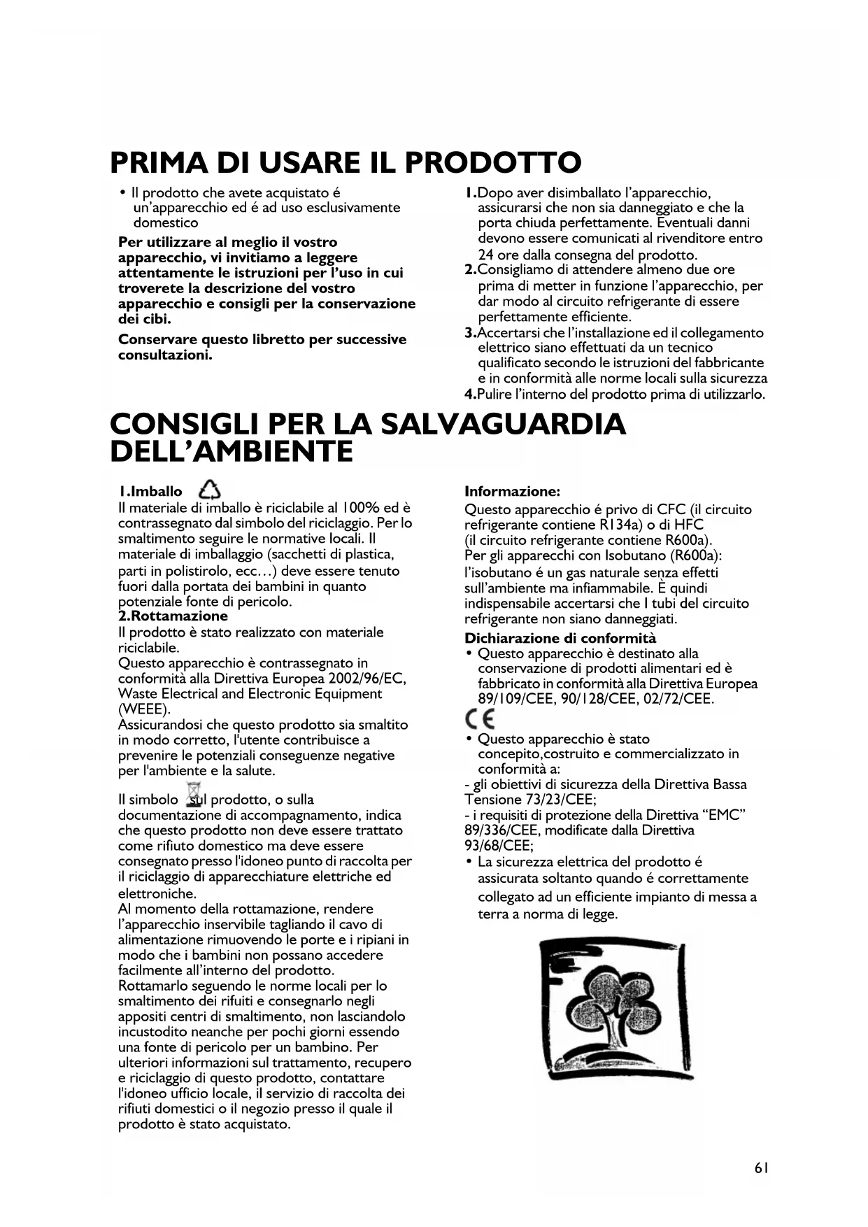 - Il prodotto che avete acquistato é un’apparecchio ed é ad uso esclusivamente domestico Per utilizzare al meglio il vostro apparecchio, vi invitiamo a leggere attentamente le istruzioni per l’uso in cui troverete la descrizione del vostro apparecchio e consigli per la conservazione dei cibi. Conservare questo libretto per successive consultazioni. 1.Dopo aver disimballato l’apparecchio, assicurarsi che non sia danneggiato e che la porta chiuda perfettamente. Eventuali danni devono essere comunicati al rivenditore entro 24 ore dalla consegna del prodotto. 2.Consigliamo di attendere almeno due ore prima di metter in funzione l’apparecchio, per dar modo al circuito refrigerante di essere perfettamente efficiente. 3.Accertarsi che l’installazione ed il collegamento elettrico siano effettuati da un tecnico qualificato secondo le istruzioni del fabbricante e in conformità alle norme locali sulla sicurezza 4.Pulire l’interno del prodotto prima di utilizzarlo. 1.Imballo Il materiale di imballo è riciclabile al 100% ed è contrassegnato dal simbolo del riciclaggio. Per lo smaltimento seguire le normative locali. Il materiale di imballaggio (sacchetti di plastica, parti in polistirolo, ecc…) deve essere tenuto fuori dalla portata dei bambini in quanto potenziale fonte di pericolo. 2.Rottamazione Il prodotto è stato realizzato con materiale riciclabile. Questo apparecchio è contrassegnato in conformità alla Direttiva Europea 2002/96/EC, Waste Electrical and Electronic Equipment (WEEE). Assicurandosi che questo prodotto sia smaltito in modo corretto, l'utente contribuisce a prevenire le potenziali conseguenze negative per l'ambiente e la salute. Il simbolo sul prodotto, o sulla documentazione di accompagnamento, indica che questo prodotto non deve essere trattato come rifiuto domestico ma deve essere consegnato presso l'idoneo punto di raccolta per il riciclaggio di apparecchiature elettriche ed elettroniche. Al momento della rottamazione, rendere l’apparecchio inservibile tagliando il cavo di alimentazione rimuovendo le porte e i ripiani in modo che i bambini non possano accedere facilmente all’interno del prodotto. Rottamarlo seguendo le norme locali per lo smaltimento dei rifuiti e consegnarlo negli appositi centri di smaltimento, non lasciandolo incustodito neanche per pochi giorni essendo una fonte di pericolo per un bambino. Per ulteriori informazioni sul trattamento, recupero e riciclaggio di questo prodotto, contattare l'idoneo ufficio locale, il servizio di raccolta dei rifiuti domestici o il negozio presso il quale il prodotto è stato acquistato. Informazione: Questo apparecchio é privo di CFC (il circuito refrigerante contiene R134a) o di HFC (il circuito refrigerante contiene R600a). Per gli apparecchi con Isobutano (R600a): l’isobutano é un gas naturale senza effetti sull’ambiente ma infiammabile. È quindi indispensabile accertarsi che I tubi del circuito refrigerante non siano danneggiati. Dichiarazione di conformità
