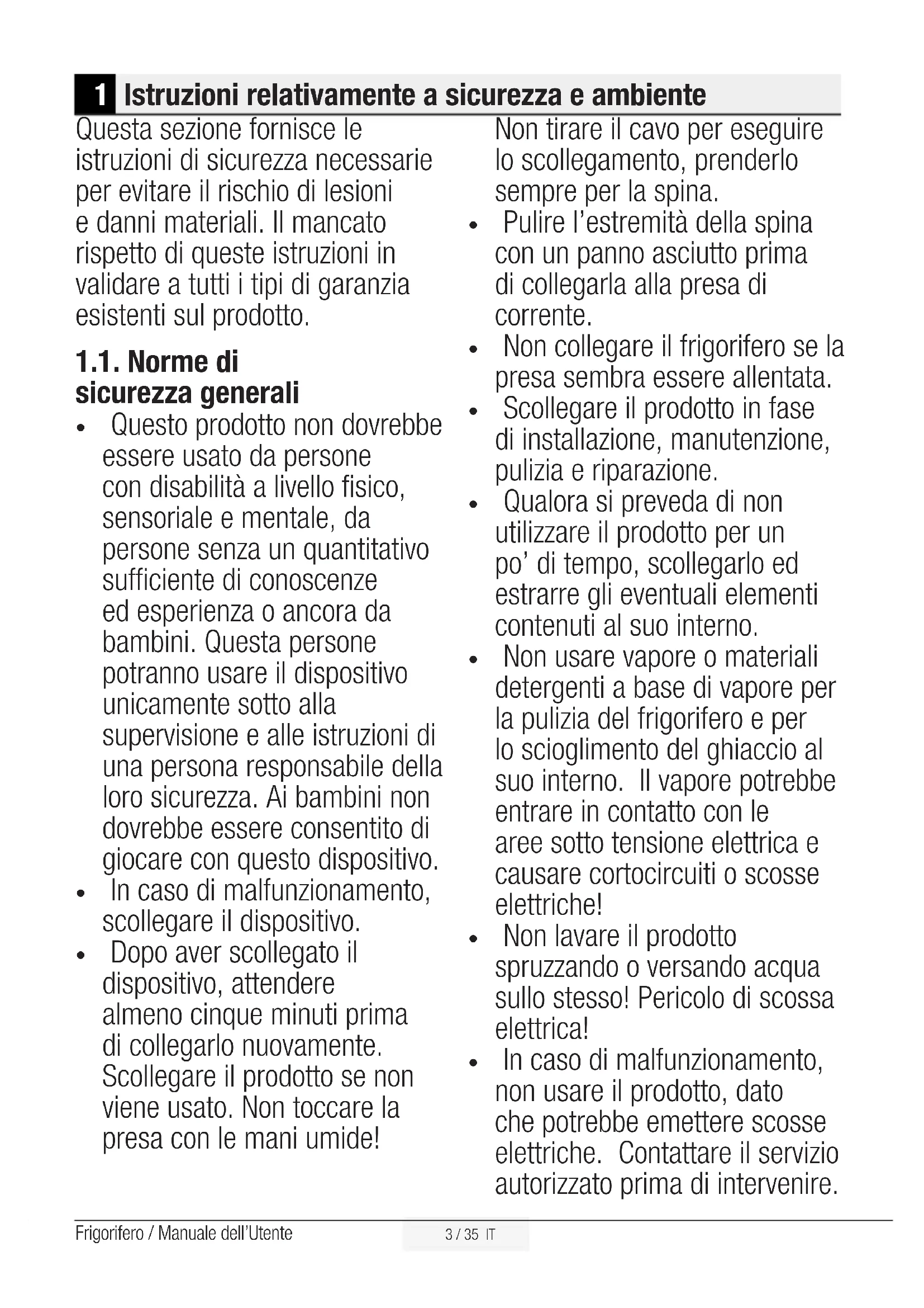 Rischio di scosse elettriche. L’imballaggio del prodot- to è fatto di materiali riciclabi- li, in conformità con la Normativa Ambientale Nazionale.2 / 35 IT Frigorifero / Manuale dell’Utente 1 Istruzioni relativamente a sicurezza e ambiente 3 1.1. Norme di sicurezza generali. . . . . . . . . . . . . 3