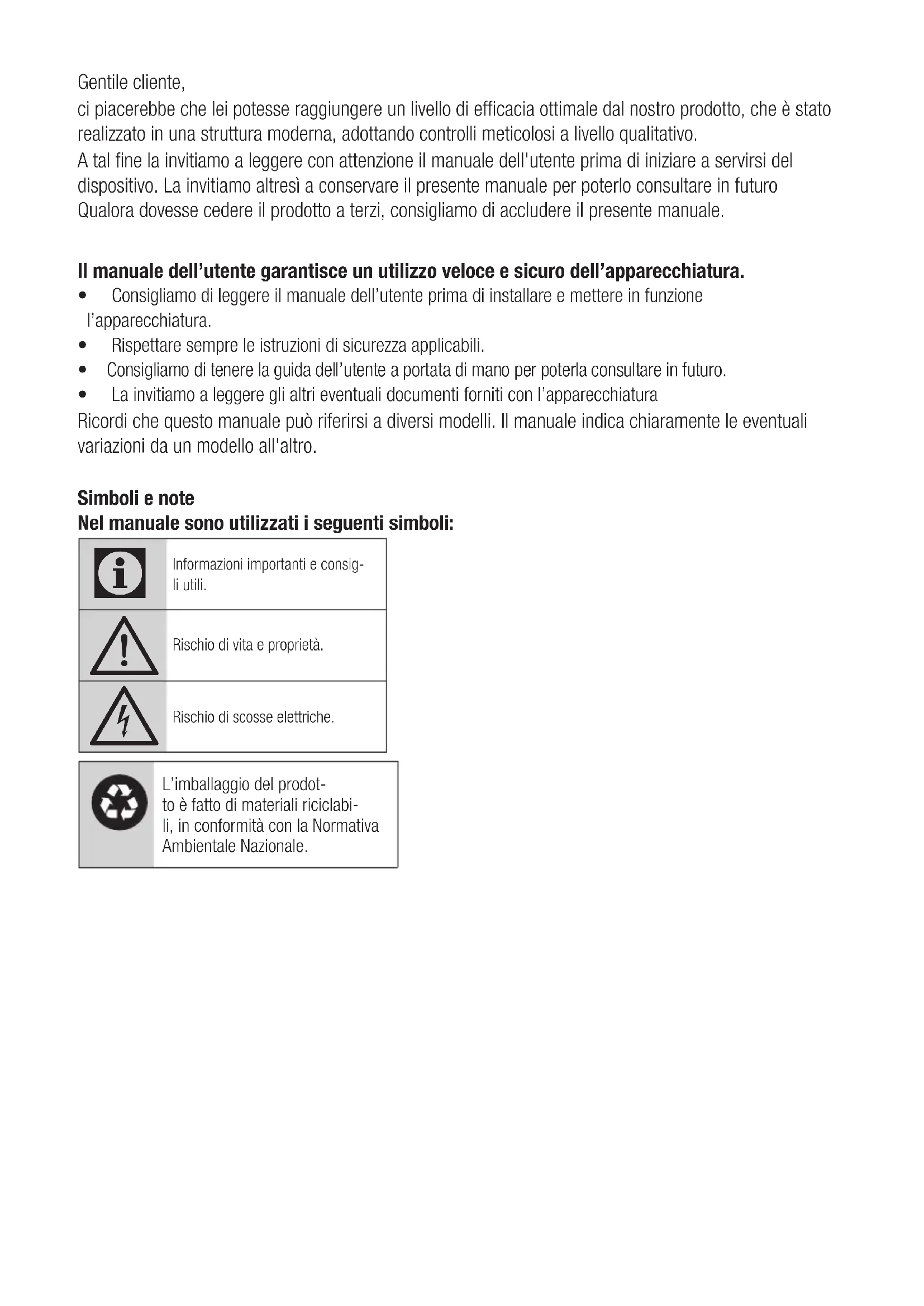 - La invitiamo a leggere gli altri eventuali documenti forniti con l’apparecchiatura Ricordi che questo manuale può riferirsi a diversi modelli. Il manuale indica chiaramente le eventuali variazioni da un modello all'altro. Simboli e note Nel manuale sono utilizzati i seguenti simboli: