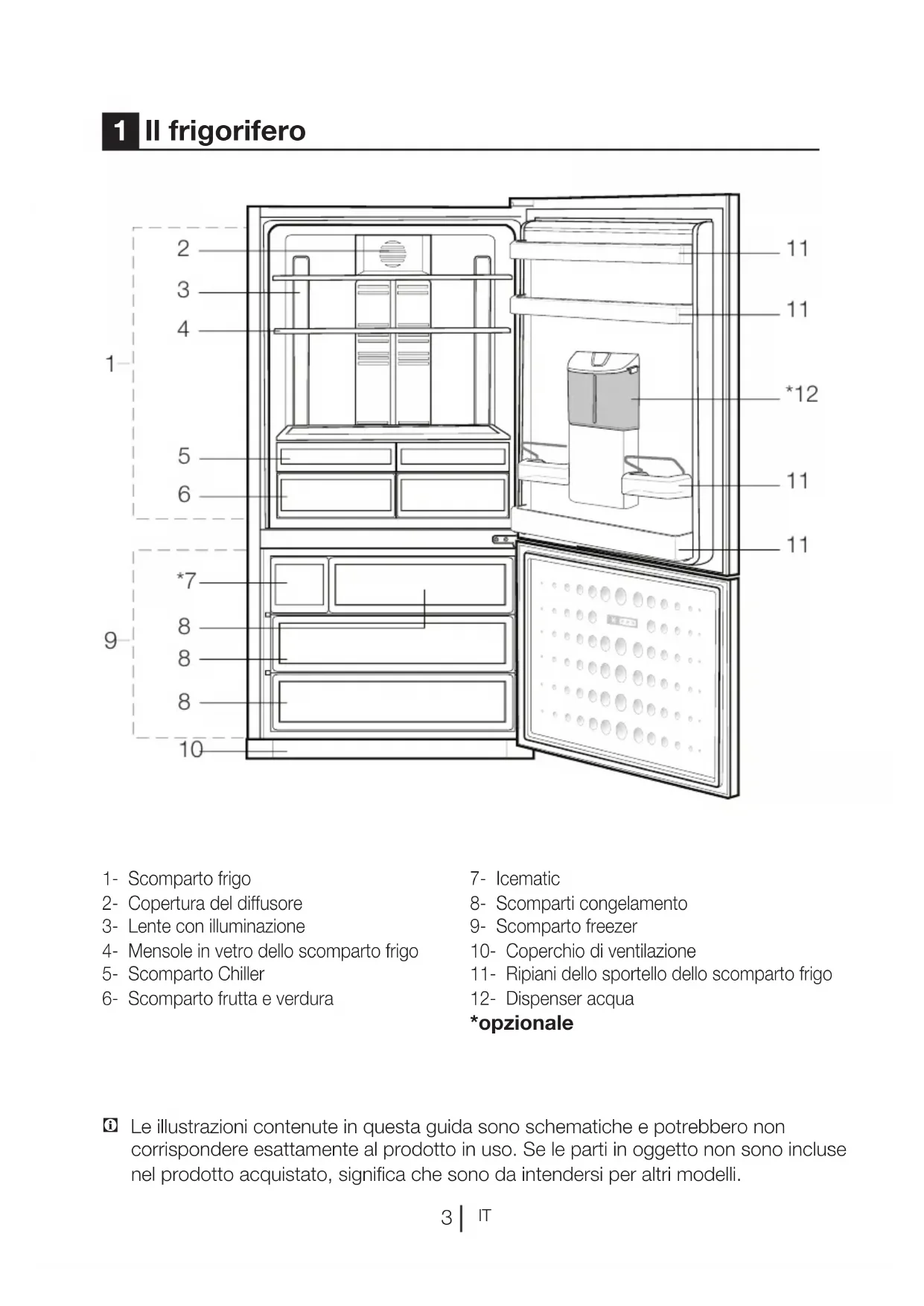 *opzionale C Le illustrazioni contenute in questa guida sono schematiche e potrebbero non corrispondere esattamente al prodotto in uso. Se le parti in oggetto non sono incluse nel prodotto acquistato, significa che sono da intendersi per altri modelli. 1 Il frigorifero