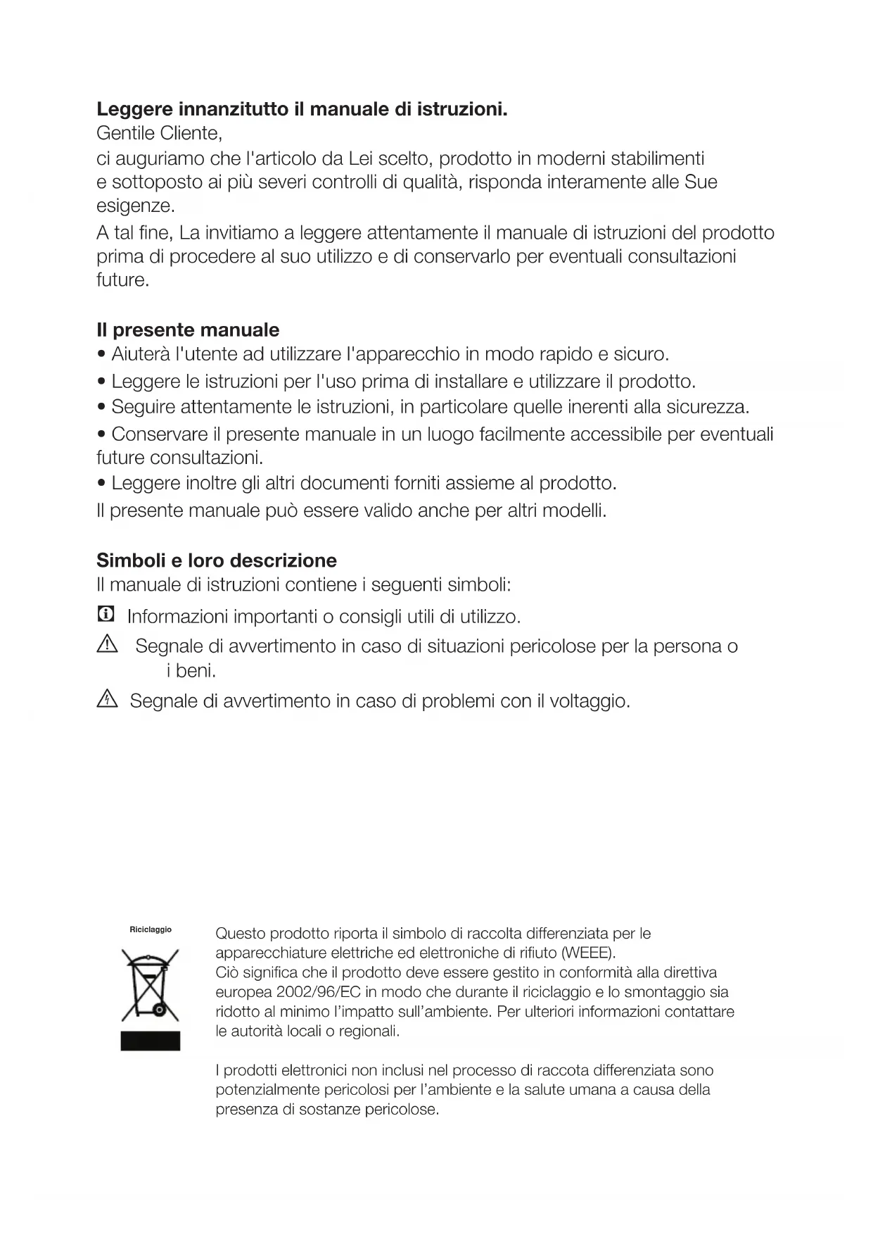 - Leggere inoltre gli altri documenti forniti assieme al prodotto. Il presente manuale può essere valido anche per altri modelli. Simboli e loro descrizione Il manuale di istruzioni contiene i seguenti simboli: C Informazioni importanti o consigli utili di utilizzo. A Segnale di avvertimento in caso di situazioni pericolose per la persona o i beni. B Segnale di avvertimento in caso di problemi con il voltaggio. Questo prodotto riporta il simbolo di raccolta differenziata per le apparecchiature elettriche ed elettroniche di rifiuto (WEEE). Ciò significa che il prodotto deve essere gestito in conformità alla direttiva europea 2002/96/EC in modo che durante il riciclaggio e lo smontaggio sia ridotto al minimo l’impatto sull’ambiente. Per ulteriori informazioni contattare le autorità locali o regionali. I prodotti elettronici non inclusi nel processo di raccota differenziata sono potenzialmente pericolosi per l’ambiente e la salute umana a causa della presenza di sostanze pericolose. RiciclaggioIT