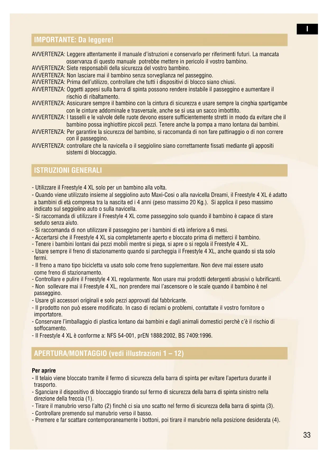 IMPORTANTE: Da leggere! AVVERTENZA: Leggere attentamente il manuale d’istruzioni e conservarlo per riferimenti futuri. La mancata osservanza di questo manuale potrebbe mettere in pericolo il vostro bambino. AVVERTENZA: Siete responsabili della sicurezza del vostro bambino. AVVERTENZA: Non lasciare mai il bambino senza sorveglianza nel passeggino. AVVERTENZA: Prima dell’utilizzo, controllare che tutti i dispositivi di blocco siano chiusi. AVVERTENZA: Oggetti appesi sulla barra di spinta possono rendere instabile il passeggino e aumentare il rischio di ribaltamento. AVVERTENZA: Assicurare sempre il bambino con la cintura di sicurezza e usare sempre la cinghia spartigambe con le cinture addominale e trasversale, anche se si usa un sacco imbottito. AVVERTENZA: I tasselli e le valvole delle ruote devono essere sufficientemente stretti in modo da evitare che il bambino possa inghiottire piccoli pezzi. Tenere anche la pompa a mano lontana dai bambini. AVVERTENZA: Per garantire la sicurezza del bambino, si raccomanda di non fare pattinaggio o di non correre con il passeggino. AVVERTENZA: controllare che la navicella o il seggiolino siano correttamente fissati mediante gli appositi sistemi di bloccaggio. ISTRUZIONI GENERALI - Utilizzare il Freestyle 4 XL solo per un bambino alla volta. - Quando viene utilizzato insieme al seggiolino auto Maxi-Cosi o alla navicella Dreami, il Freestyle 4 XL é adatto a bambini di età compresa tra la nascita ed i 4 anni (peso massimo 20 Kg.). Si applica il peso massimo indicato sul seggiolino auto o sulla navicella. - Si raccomanda di utilizzare il Freestyle 4 XL come passeggino solo quando il bambino è capace di stare seduto senza aiuto. - Si raccomanda di non utilizzare il passeggino per i bambini di età inferiore a 6 mesi. - Accertarsi che il Freestyle 4 XL sia completamente aperto e bloccato prima di metterci il bambino. - Tenere i bambini lontani dai pezzi mobili mentre si piega, si apre o si regola il Freestyle 4 XL. - Usare sempre il freno di stazionamento quando si parcheggia il Freestyle 4 XL, anche quando si sta solo fermi. - Il freno a mano tipo bicicletta va usato solo come freno supplementare. Non deve mai essere usato come freno di stazionamento. - Controllare e pulire il Freestyle 4 XL regolarmente. Non usare mai prodotti detergenti abrasivi o lubrificanti. - Non sollevare mai il Freestyle 4 XL, non prendere mai l’ascensore o le scale quando il bambino è nel passeggino. - Usare gli accessori originali e solo pezzi approvati dal fabbricante. - Il prodotto non può essere modificato. In caso di reclami o problemi, contattate il vostro fornitore o importatore. - Conservare l’imballaggio di plastica lontano dai bambini e dagli animali domestici perchè c’è il rischio di soffocamento. - Il Freestyle 4 XL è conforme a: NFS 54-001, prEN 1888:2002, BS 7409:1996. APERTURA/MONTAGGIO (vedi illustrazioni 1 – 12) Per aprire - Il telaio viene bloccato tramite il fermo di sicurezza della barra di spinta per evitare l’apertura durante il trasporto. - Sganciare il dispositivo di bloccaggio tirando sul fermo di sicurezza della barra di spinta sinistro nella direzione della freccia (1). - Tirare il manubrio verso l’alto (2) finchè ci sia uno scatto nel fermo di sicurezza della barra di spinta (3). - Controllare premendo sul manubrio verso il basso. - Premere e far scattare contemporaneamente i bottoni, poi tirare il manubrio nella posizione desiderata (4).I Montaggio delle ruote - Le 2 ruote con il cilindro di freno vanno montate come ruote posteriori. - Premere il bottone al centro della ruota (5/8) spingendo allo stesso tempo l’asse dentro la relativa apertura (7). - Accertarsi che la ruota sia bloccata. - Controllare la pressione dei pneumatici e gonfiare i pneumatici se necessario (vedi capitolo sulla manutenzione per la pressione massima autorizzata). Smontare le ruote - Per smontare le ruote posteriori, premere il bottone sulla ruota (5/8) e tirar fuori la ruota dall’apertura dell’asse (9). Regolare il manubrio - Per regolare l’altezza del manubrio, premere contemporaneamente i bottoni di sblocco (4.1) e far ruotare il manubrio nella posizione desiderata (4.2). Piegare - Premere contemporaneamente i bottoni di sblocco e far ruotare il manubrio verso il basso. - Ripiegare la capottina (vedi “Fissaggio e Rimozione della capottina”) - Inclinare il fermo di piegatura sopra il fermo di sicurezza destro della barra di spinta (10). - Tirare i fermi di sicurezza destro e sinistro verso l’alto e spingere il maniglione in avanti finchè il Freestyle 4 XL sia piegato (11). - Accertarsi che il fermo di sicurezza della barra di spinta faccia uno scatto nel fermo di sicurezza di trasporto (12). - Rimuovere le ruote affinchè il passeggino sia ancora più piccolo. FRENO DI STAZIONAMENTO (vedi illustrazione 13) - Usare sempre il freno quando si parcheggia il Freestyle 4 XL, “anche quando si sta solo fermi”. - Premere il pedale con il piede sull’asse posteriore per bloccare le ruote (13). - Liberare il freno di stazionamento alzando il pedale. - Il freno a mano permette di rallentare e non deve essere usato come freno di stazionamento. Il freno a mano opera su entrambe le ruote posteriori. Se si stringe il freno a mano troppo fermamente o rapidamente, si rischia di inciampare nel Freestyle 4 XL, e quindi di mettere il bambino in pericolo. - Accertarsi sempre che le ruote siano bloccate.